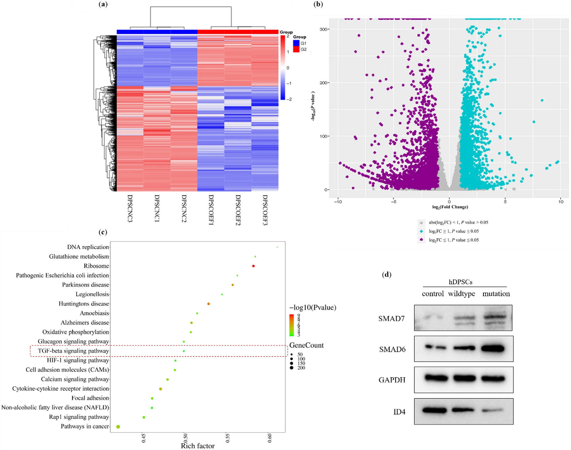 Fig. 4. a Heatmap showing the expression levels of transcripts in samples from the FGFR1 overexpression and control groups. Red color refers to upregulation, and blue color refers to downregulation of gene transcription. b Volcano plot of differentially expressed genes. Purple dots represent down-regulated genes, and turquoise dots represent up-regulated genes. c KEGG pathway analysis ranked the top 20 KEGG pathways (|log2FC|1 and p0.05). d Protein levels of pathway genes were assayed in the cells transfected by control, wildtype and mutation lentivirus by western blot