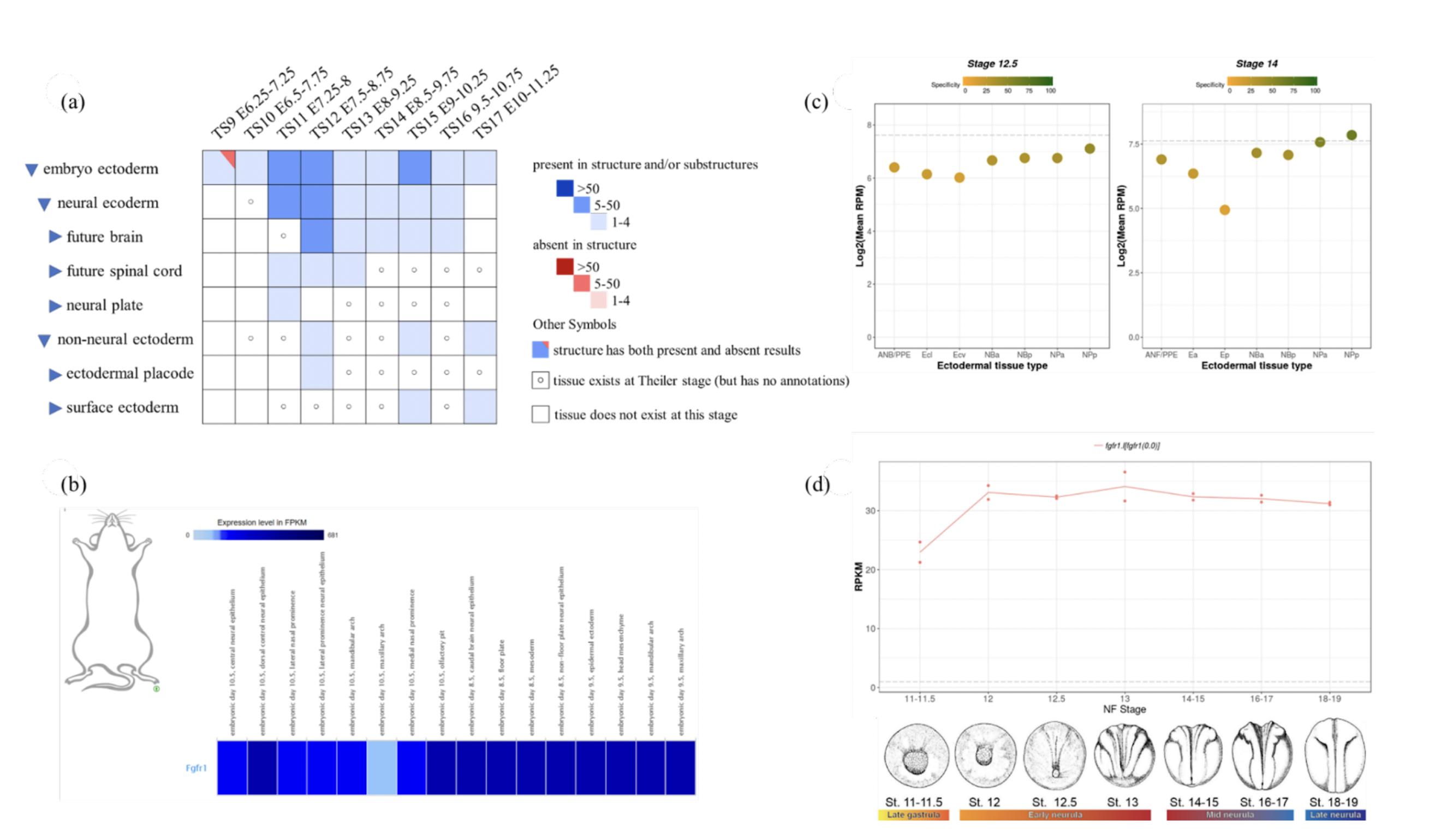 Figure S1. Gene expression studies of FGFR1. FGFR1 expression during early embryonic development of mice (a, b) and Xenopus laevis frogs (c, d).