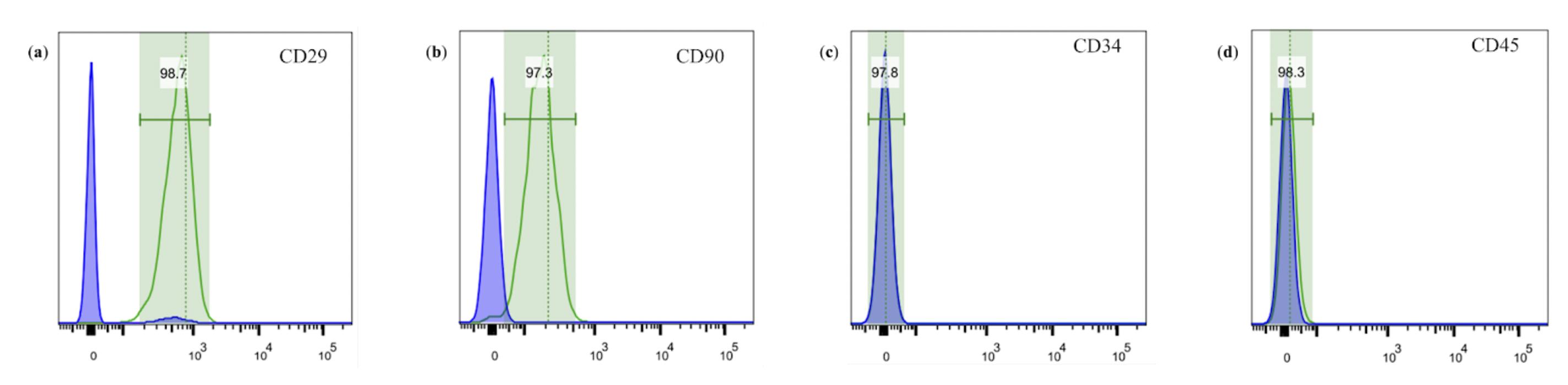 Figure S2. Flow cytometric identification of hDPSCs surface markers shows stem cell characteristics. (a-b) Flow cytometry demonstrated that DPSCs presented positive for CD29 and CD90. (c-d) Flow cytometry showed that DPSCs were negative for hematopoietic markers of CD34 and CD45.