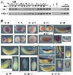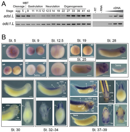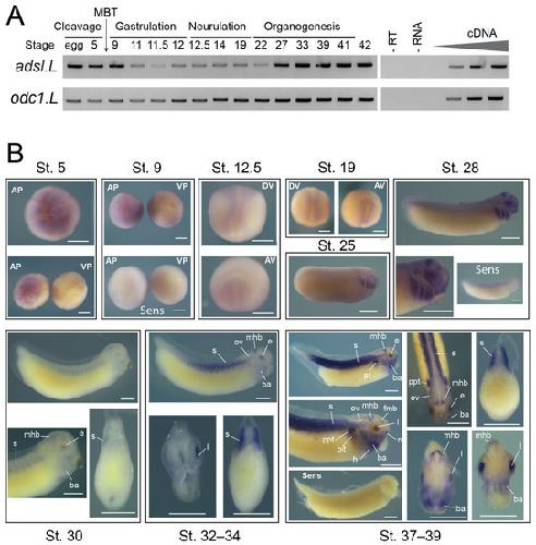 Figure 2. Spatiotemporal expression of adsl.L gene during X. laevis embryonic development. (A) Temporal expression profiles of adsl.L gene during embryogenesis. The expression profile was determined using RT-PCR from the cDNA of the fertilized oocyte (egg) and whole embryo at indicated stages covering the different phases of X. laevis embryogenesis. The ornithine decarboxylase gene odc1.L was used as a loading control and negative controls were performed by omitting either reverse transcriptase (-RT) or RNA (-RNA) in the reaction mix. Linearity was determined via dilutions of cDNA from stage 39 for adsl.L and 41 for odc1.L. Mid-blastula transition (MBT) is indicated. (B) Spatial expression profile of adsl.L gene during embryogenesis. Whole-mount in situ hybridization with adsl.L-specific DIG-labeled antisense or sense RNA probes was performed on embryos from stages (St.) 5 to 37–39. St. 5 and 9: animal (AP) and vegetal (VP) pole views, St. 12.5 and 19: dorsal (DV) and anterior (AV) views; later stages: lateral views, with dorsal up and anterior on the right, and dorsal view at stages 37–39. Transverse sections are dorsal up. Abbreviations: ba, branchial arches; e, eye; fmb, forebrain–midbrain boundary; h, heart; l, lens; mhb, midbrain–hindbrain boundary; n: nasal placode; ov, otic vesicle; ppt, pronephric proximal tubules; pit, pronephric intermediate tubules; s, somites. Bars: 0.5 mm.