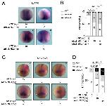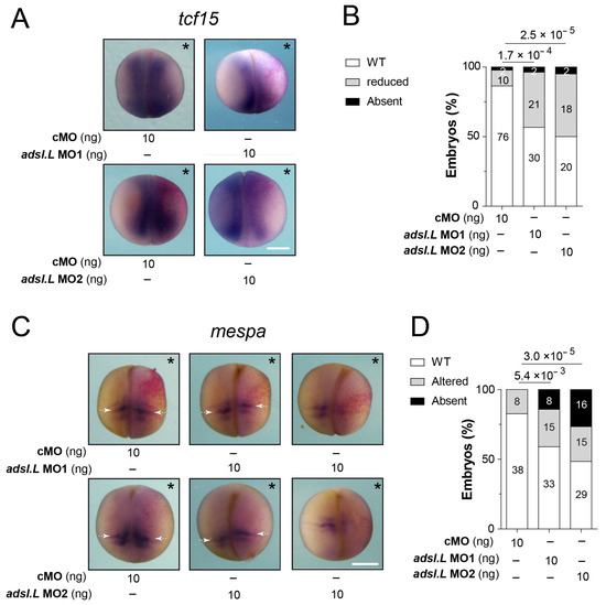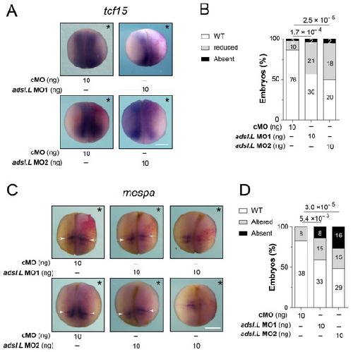 Figure 4. The adsl.L gene is required for the expression of tcf15 and mespa genes involved in early somitogenesis. Expression of tcf15 (A,B) and mespa (C,D) genes at late neurula stage is altered by the knockdown of adsl.L gene. Representative images of trf15 (A) and mespa (C) RNA expression revealed via in situ hybridization. Statistics are shown in (B) and (D) for trf15 and mespa RNA, respectively. White arrows point to the anterior domain of the somitomere S-II on both sides of the embryos. Injected side is indicated by asterisks. Numbers above the bars of histograms correspond to p-values. Bars: 0.5 mm.