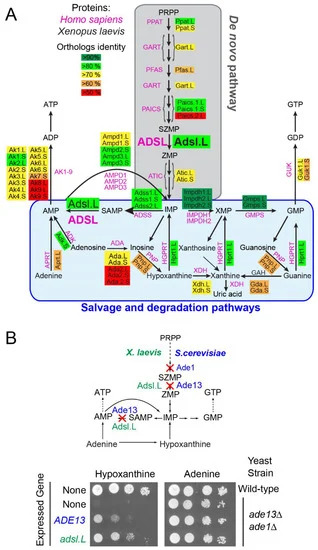 Figure 1. The X. laevis adsl.L gene encodes the adenylosuccinate lyase activity required in two non-sequential steps of the highly conserved purine synthesis pathways. (A) Schematic representation of the human and X. laevis purine biosynthesis pathways. Abbreviations: AMP, adenosine monophosphate; GMP, guanosine monophosphate; IMP, Inosine monophosphate; PRPP, Phosphorybosyl pyrophosphate; SAMP, Succinyl-AMP; SZMP, Succinyl-Amino Imidazole Carboxamide Ribonucleotide monophosphate; XMP, Xanthosine monophosphate; ZMP, Amino Imidazole CarboxAmide Ribonucleotide monophosphate. (B) Functional complementation of the growth defect of the yeast adenylosuccinate lyase deletion mutant via expression of the X. laevis adsl.L ortholog gene. Yeast wild-type and adsl knockout mutant (ade13 ade1) strains were either transformed with a plasmid, allowing for expression of the Saccharomyces cerevisiae (ADE13) or the X. laevis (adsl.L) adenylosuccinate lyase encoding genes, or with the empty vector (None). Serial dilutions (1/10) of transformants were dropped on SDcasaWA medium supplemented with either hypoxanthine or adenine as the sole external purine source. Plates were incubated for 48 h at 37 °C before imaging. Of note, the ade1 ade13 double deletion mutant was used in this experiment to avoid genetic instability associated with the accumulation of SZMP and/or its nucleoside derivatives observed in the single ade13 mutant [8].
