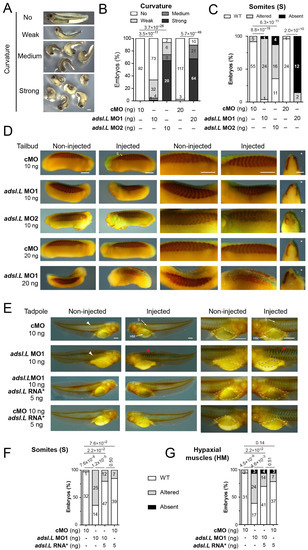 Figure 3. The adsl.L gene is required for somites and hypaxial muscle formation in X. laevis. (A) Representative images of adsl.L morphants following adsl.L MO1 injection at either 10 ng (weak and medium curvature) or 20 ng (medium and strong curvature). (B) Quantification and statistics of the curvature phenotype. (C–G) Immunostaining with the differentiated muscle-cell-specific 12-101 antibody revealed a strong alteration of somites and hypaxial muscle formation in adsl.L knockdown and adsl.L overexpressing embryos. Representative images (D,E) and quantification and statistics (C,F,G) of somites and hypaxial muscles phenotype at tailbud (C,D) and tadpole (E–G) stages. Injected side is indicated by asterisks. S, somites; HM, hypaxial muscles. Bars: 0.5 mm. White and red arrowheads point to typical somite chevron shapes and altered somites, respectively. The adsl.L RNA* refers to mutated RNA whose translation was not affected by the adsl.L specific MOs (Figure S3). Numbers above the bars of histograms correspond to p-values.