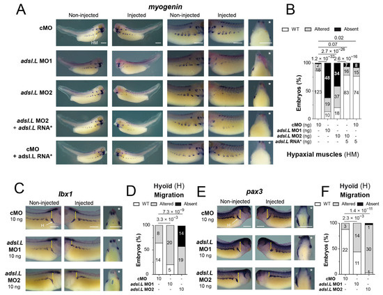Figure 7. The adsl.L gene is required for hypaxial muscle migration. (A,B) The hypaxial muscle defect associated with adsl.L knockdown was rescued by the MO non-targeted adsl.L RNA*. Representative images (A) and quantifications (number in bars) and statistics (B) of the adsl.L-dependent alteration of myogenin gene expression monitored via in situ hybridization. (C–F) Migration of myoblasts in the hyoid region was found to be severely affected in adsl.L morphants, as shown by lbx1 (C,D) and pax3 (E,F) gene expression pattern alterations. Injected side is indicated by asterisks. Bars: 0.5 mm. HM and H stand for hypaxial muscles and hyoid region, respectively. Numbers above the bars of histograms correspond to p-values.