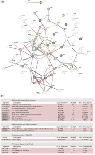 Figure 4 Proteins identified by LC/MS/MS and present in Xenopus cranial placodes. (a) Putative interactions were analyzed using the String website (https://version-11-5.string-db.org/cgi/network?networkId=b3V8l02dS8mr). Proteins with known physical or functional interactions are linked. (b) Proteins with roles in otic development, hearing loss, nuclear localization, or transcriptional regulation are color-coded. LC/MS/MS, liquid chromatography with tandem mass spectrometry. |