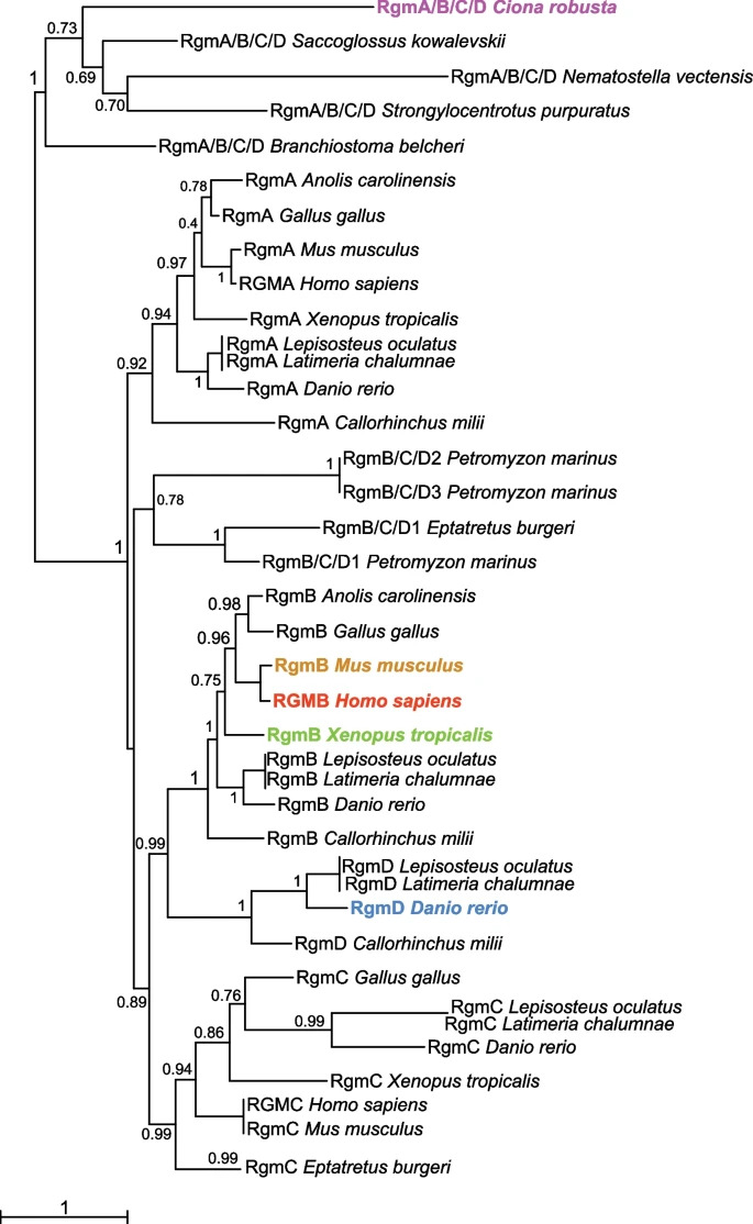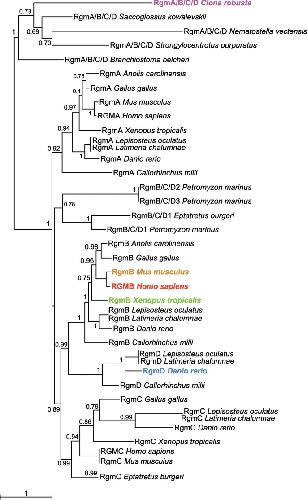 Fig. 2 Phylogenetic reconstruction of the evolutionary relationships within the Rgm gene family. ML phylogenetic tree showing the relationships among members of different Rgm classes. Proteins encoded by genes present in invertebrates in single copy and equally related to the RgmA-D classes have been indicated as RgmA/B/C/D. RgmA, RgmB, and RgmC were found in all the vertebrates analyzed in this study, while RgmD genes have only been reported, thus far, in teleosts and cartilaginous fish. Distinct colors highlight the family members analyzed in this study. Values reported at the branching points indicate replicates obtained using the aLRT method |