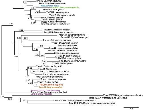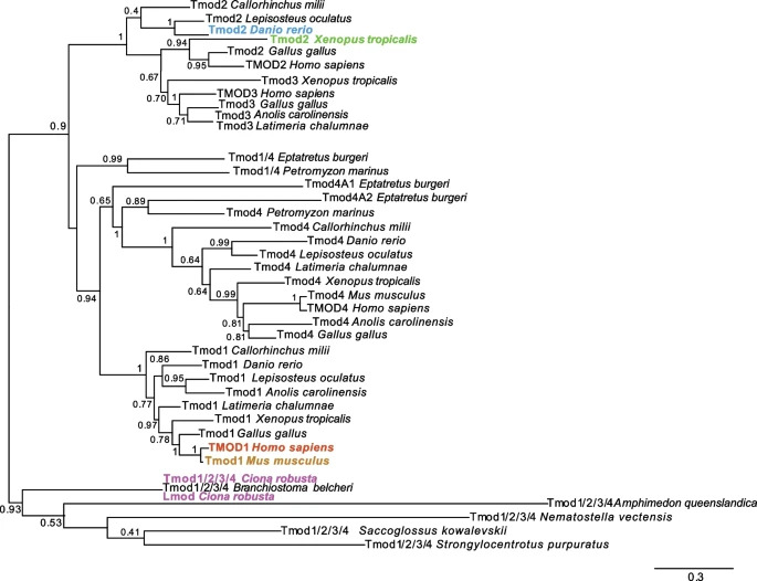 Fig. 3 Phylogenetic reconstruction of the evolutionary relationships within the Tmod gene family. ML phylogenetic tree displaying the relationships among members of different Tmod classes. Proteins encoded by genes present in invertebrates in single copy and equally related to the 1–4 classes have been tentatively indicated as Tmod1/2/3/4. Tmod1, Tmod2, Tmod3 and Tmod4 have been found in all the vertebrates analyzed here. Distinct colors highlight the family members analyzed in this study. Values reported at the branching points indicate replicates obtained using the aLRT method |
