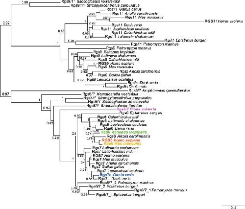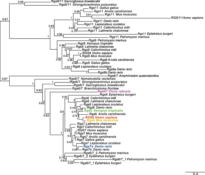 Fig. 4 Phylogenetic reconstruction of the evolutionary relationships between proteins of the Rgs6/7 and Rgs9/11 subfamilies. A global phylogenetic study of the Rgs proteins found in Ciona robusta is available [38]. This ML phylogenetic tree is centered on the Rgs6/7 subfamily, since the expression of some of its members has been studied here, and on the Rgs9/11 subfamily, because of its close relationship to the Rgs6/7 subfamily. Distinct colors highlight the family members whose expression was analyzed in this study. Values at the branches indicate replicates obtained using the aLRT method |