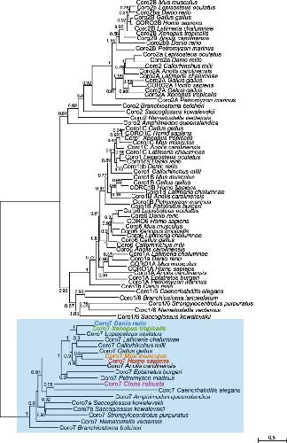 Fig. 5 Phylogenetic reconstruction of the evolutionary relationships within the Coronin gene family. ML phylogenetic tree of the Coronin (Coro) family. The Coro7 subfamily is highlighted by a light blue box. Distinct colors indicate the family members whose expression was analyzed in this study. Values reported at the branching points indicate replicates obtained using the aLRT method |