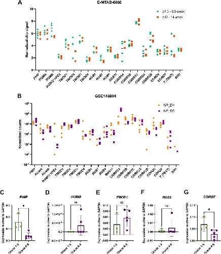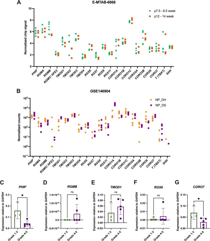 Fig.9 Expression of the genes of interest in human nuclei pulposi. A Normalized chip signals plotted as gene expression measures from microarray data (E-MTAB-6868; [88]) obtained from notochordal cells from human embryonic (7.5–8.5 weeks post-conception, n = 3) and fetal (12–14 weeks post-conception, n = 2) stages. B Log2 normalized read counts plotted as gene expression measures from the RNA-seq data of NP samples from lumbar disc herniation (DH, n = 5), and lumbar disc spondylolisthesis (DS, n = 5) obtained from the GEO database (GSE146904; [89]). Expression of PHIP (C), RGMB (D), TMOD1 (E), RGS6 (F), and CORO7 (G) relative to GAPDH, measured by qPCR analysis in the NP tissue collected from less degenerated (Grade 1–3) or moderately to severely degenerated (Grade 4–5) lumbar disc from human male and female of various age groups (see Methods). Results are presented as scatter dot plots with mean and standard deviation for each cohort. The qPCR results plotted in (C-G) were analyzed by unpaired t -test. * = p < 0.05. p, post-conception |