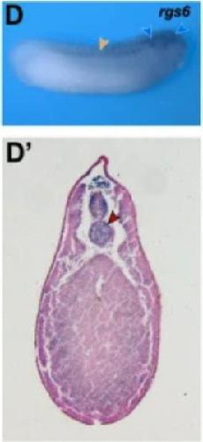 rgs6 (regulator of G-protein signaling 6) expression in Xenopus laevis embryo, NF stage 28 (top) assayed via in situ hybridization, lateral view, anterior right, dorsal up, and transverse sections of mid trunk region of NF stage 32 |