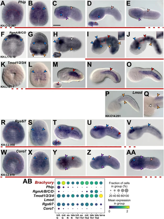 Fig. 1 Identification of genes expressed during notochord development in Ciona robusta. Ciona robusta embryos ranging from early gastrula to late tailbud, hybridized in situ with antisense RNA probes specific for the genes reported on top of panels A, F, K, P, R, W (Table S1). Gene models are indicated in the bottom left corners. Insets in (D, H, M, T) show embryos at different developmental stages. Insets in (I, J) show a higher magnification view of the regions boxed in red in the main panels, to display staining in notochord cells, which is clearer in the trunk because it is not obscured by the staining in muscle cells. Stained territories are denoted by arrowheads, color-coded as follows: red, notochord; light pink, fading notochord staining; white, no detectable notochord staining; blue, CNS; purple, mesenchyme; orange, muscle. Red lines underneath the panels indicate the approximate time span of notochord expression throughout development. In (A, F, K, R, W) dashed curved lines delineate the location of notochord precursors. Scale bar: 50 µm. (AB) Dot plot summary of the published scRNA-Seq data [50] available for the genes in (A-AA), compared to the scRNA-Seq data available for Ciona Brachyury, which was used as a reference for notochord expression [51]. In the dot plot, each dot represents two values: the mean expression of each gene (visualized by color) and the fraction of cells expressing each gene (visualized by the size of the dot). The embryonic stages used by Cao et al. [50] to generate the scRNA-Seq dataset reflect only approximately the stages that we used for WMISH. Abbreviations: init., initial; md., middle; ea., early; G, gastrula; N, neurula; Tb, tailbud |