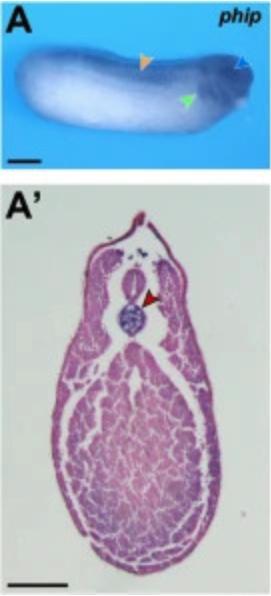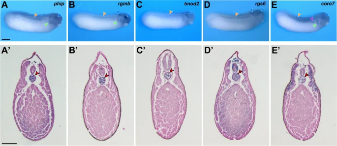 Fig. 7 Expression of phip, rgmb, tmod2, rgs6 and coro7 in Xenopus laevis. A-E Whole-mount in situ hybridization of NF stage 28 embryos. Lateral views, anterior to the right, dorsal on top. (A’-E’) Transverse sections of NF stage 32 embryos. Dorsal is on top. Arrowheads color code: red, notochord; blue, nervous system; orange, somites; green, branchial arches; violet, pronephros. Scale bars: 500 µm (A); 200 µm (A’) |