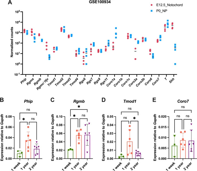 Fig. 8 Gene expression analysis in mouse nuclei pulposi. A Normalized read counts in E12.5 notochord and P0 NP cells from the GSE100934 dataset [82]. B-E Multiplex qPCR analysis showing the expression of Phip (B), Rgmb (C), Tmod1 (D), and Coro7 (E) relative to Gapdh in one-week (n = 3), one-year (n = 6) and two-year (n = 6) old mouse NP cells from lumbar IVDs of wild-type mice. Results are presented as scatter dot plots with mean and SD for each cohort. The qPCR results plotted in (B-E) were analyzed by ordinary one-way ANOVA followed by Tukey’s multiple comparisons test. * = p < 0.05 |