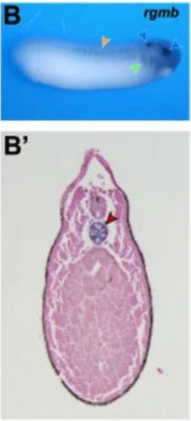 rgmb (repulsive guidance molecule BMP co-receptor b) expression in Xenopus laevis embryo, NF stage 28 (top) assayed via in situ hybridization, lateral view, anterior right, dorsal up, and transverse sections of mid trunk region of NF stage 32 |