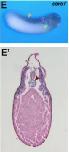 tmod2 (tropomodulin 2) expression in Xenopus laevis embryo, NF stage 28 (top) assayed via in situ hybridization, lateral view, anterior right, dorsal up, and transverse sections of mid trunk region of NF stage 32 |