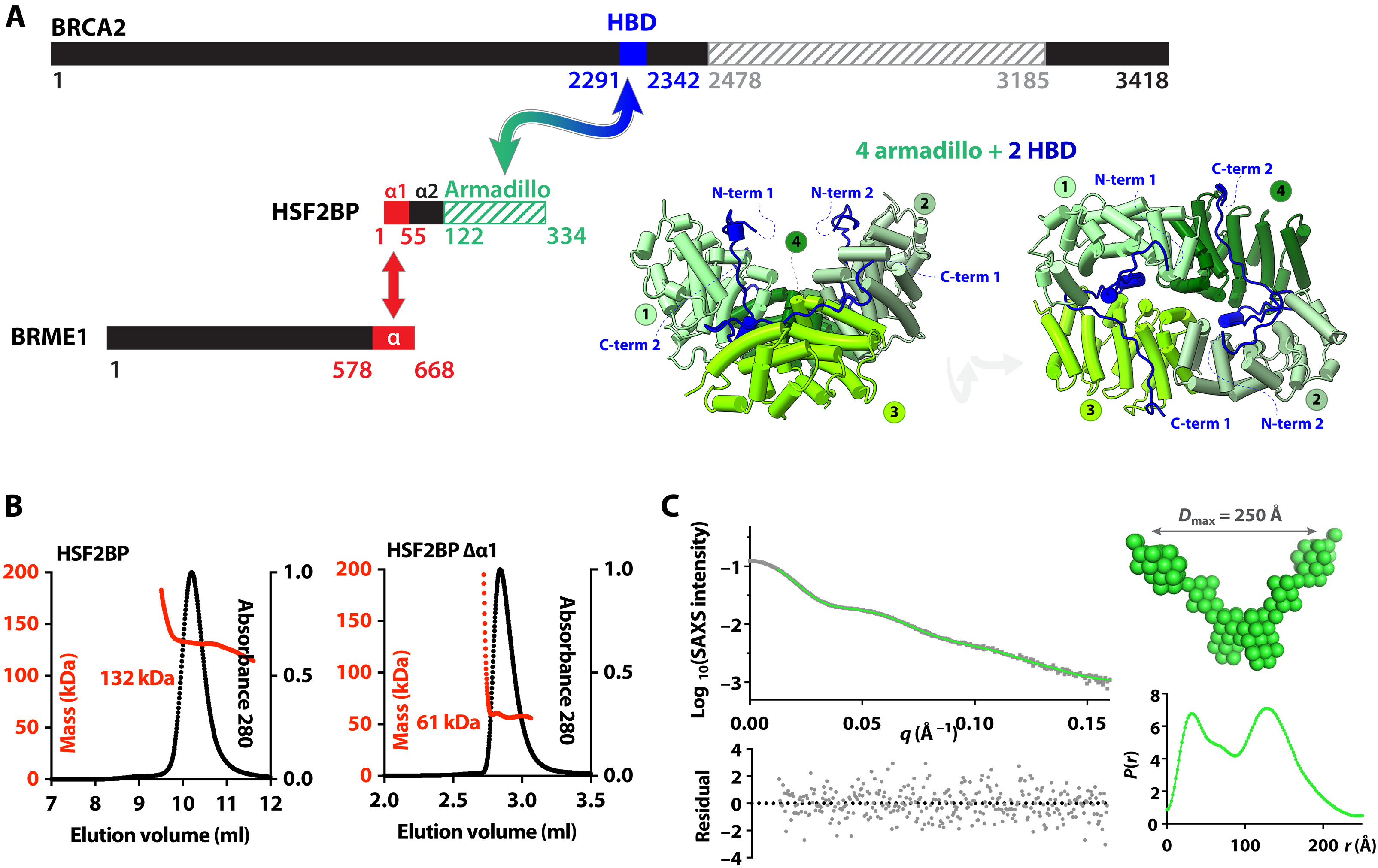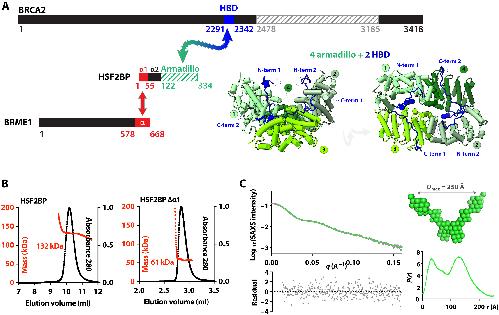 Fig. 1. HSF2BP is a tetramer formed by two dimers interacting through the N-terminal helix α1. (A) BRCA2, HSF2BP, and BRME1 domains and interactions. Folded domains of known three-dimensional (3D) structure are marked with stripes. Cocrystallized regions of BRCA2 (HBD) and HSF2BP (armadillo) are colored in blue and green, respectively; their 3D structure cartoon is shown in two different orientations [Protein Data Bank (PDB) code: 7BDX]. Regions of HSF2BP and BRME1 that interact (16) are colored in red. (B) SEC-MALS analysis of full-length HSF2BP [monomer weight-average molecular weight (Mw) 37.6 kDa; column: Superdex 200 10/300 GL] and HSF2BP deleted from helix α1 (monomer Mw 32.2 kDa; column: BIOSEC 3). See fig. S1A for replicates. (C) SEC-SAXS curve and resulting distance distribution, obtained on full-length HSF2BP. The SAXS curve is plotted as a function of the scattering angle [experimental curve in black dots; P(r) Fourier Transform in green). The distance distribution P(r) is plotted as a function of the distance. The deduced HSF2BP mass is 156 ± 21 kDa. Calculation of an ab initio model [average model in green spheres; more models in fig. S1 (B and C)] from the SAXS data suggests that HSF2BP has a V shape. |