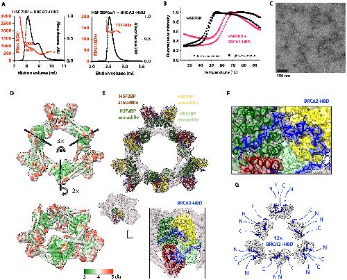 Fig. 2. HSF2BP oligomerizes into a ring-shaped complex upon binding to BRCA2-HBD. (A) SEC-MALS analysis of HSF2BP bound to BRCA2-HBD (column: Superdex 200 10/300 GL) and HSF2BP deleted from helix α1 bound to BRCA2-HBD (column: BIOSEC 3). See fig. S1A for replicates. (B) Thermal stability of HSF2BP, either free or bound to BRCA2-HBD. The denaturation temperature of HSF2BP shifted from 45.9° to 46.7°C to 59° to 60.7°C upon binding to BRCA2-HBD. (C) Negative-staining EM image obtained on a sample of HSF2BP bound to BRCA2-HBD. (D) Cryo-EM map of HSF2BP bound to BRCA2-HBD. Top and side views are displayed with an electron density threshold of 0.05. The map shows a D3 symmetry. It is colored as a function of the local resolution: from green (3 Å) to red (5 Å). (E) Docking of the crystal structure of the complex between HSF2BP armadillo domain and BRCA2-HBD (PDB: 7BDX) into the cryo-EM map. In the top view, a crystal structure is positioned in each of the six globular subvolumes of the map, whereas in the side view, only one crystal structure is displayed. Each crystal structure contains four armadillo domains (in light green, yellow, green, and maroon) bound to two BRCA2-HBD peptides (in blue). In the boxed side view, the map is colored as the docked chains of the crystal structure. (F) Zoom view on one of the BRCA2 peptides docked into the cryo-EM map. The position of this peptide, represented in blue sticks, readily fits into the cryo-EM density map of the complex between HSF2BP and BRCA2-HBD. The map is colored as the docked chains of the crystal structure. (G) Orientations of the N and C termini of the 12 BRCA2 peptides in the complex. All the BRCA2 extremities are located on the outer surface of the ring shape. |