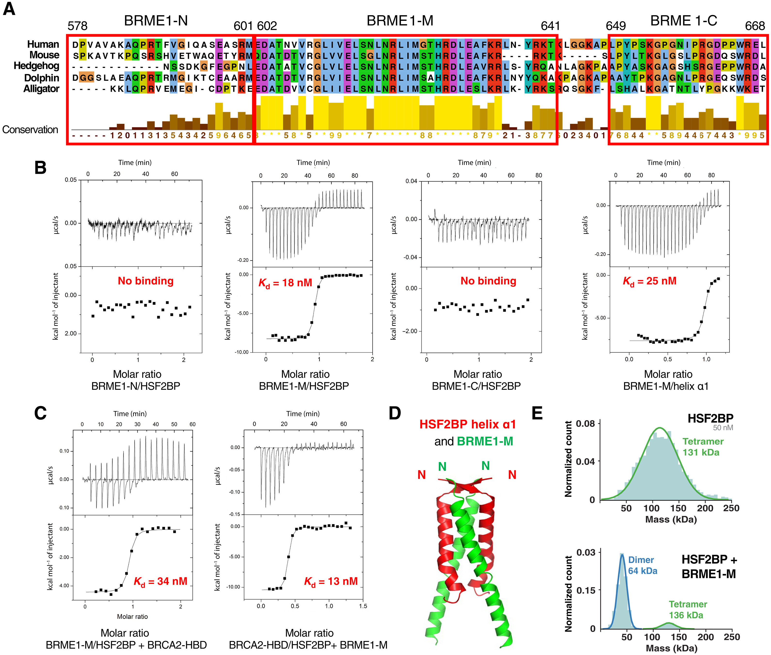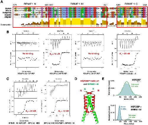 Fig. 4. A BRME1 peptide binds to helix α1 and disrupts the HSF2BP tetramer. (A) Sequence alignment of the C-terminal region of a set of five BRME1 proteins, showing a representative sequence diversity. The sequences corresponding to the three human peptides BRME1-N, BRME1-M, and BRME1-C are boxed. (B) ITC curves identifying the BRME1 sequence binding to HSF2BP. These experiments were all performed at 30°C. Additional experiments performed at 20°C are detailed in fig. S5A and Table 1. (C) ITC curve showing that BRME1-M and BRCA2-HBD do not compete for binding to HSF2BP. These experiments were performed at 20°C. (D) Crystal structure of the HSF2BP peptide E19-V50 (helix α1, in red) bound to the BRME1 peptide E602-K641 (BRME1-M, in green). Each asymmetric unit contained a HSF2BP-BRME1 dimer. The heterotetramer was calculated by application of a twofold crystallography symmetry (table S2). (E) Mass photometry experiment performed on either free HSF2BP (top) or HSF2BP bound to BRME1-M (bottom). The distribution of masses is displayed for samples at a concentration of 50 nM for HSF2BP and 100 nM for BRME1-M. HSF2BP analyzed at 25 nM is shown in fig. S6C. |