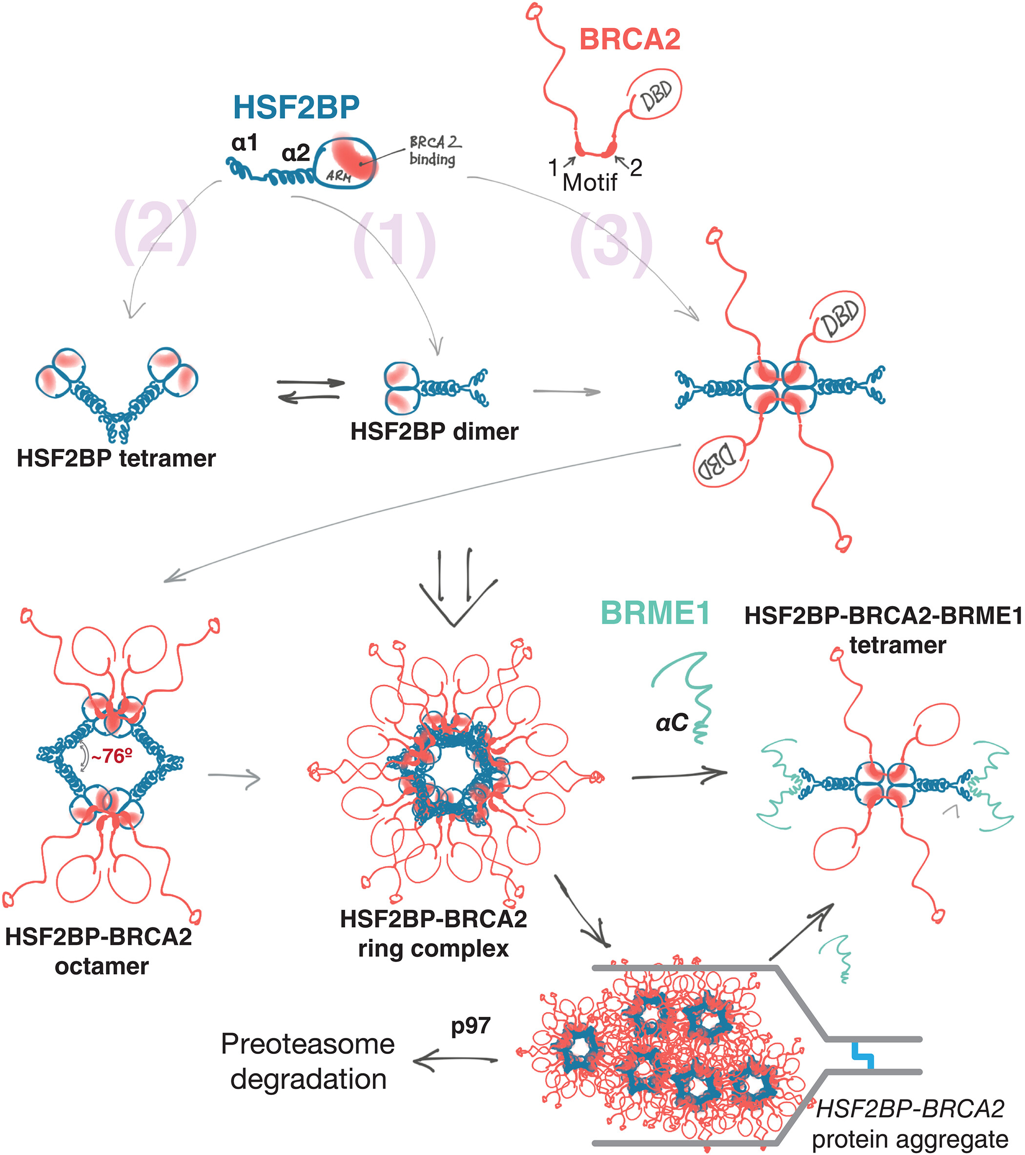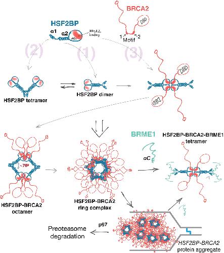 Fig. 7. Oligomeric states of HSF2BP and the “aggregator-disaggregator” model proposed to explain the effects of HSF2BP and BRME1 on BRCA2 in somatic and germline cells. Oligomers observed experimentally are indicated in bold. Two intrinsic [(1) and (2)] and one BRCA2-mediated (3) oligomerization mechanisms result in the formation of a constitutive homodimer, a V-shaped tetramer, and a large ring complex. This concentrates and organizes BRCA2, but at replication fork stalled at crosslink, it results in aggregation and proteasomal degradation of BRCA2. BRME1 competes with one of the oligomerization mechanisms (2), resulting in the formation of a 4× HSF2BP:2× BRCA2:4× BRME1 complex and thus preventing or reversing BRCA2 aggregation. |