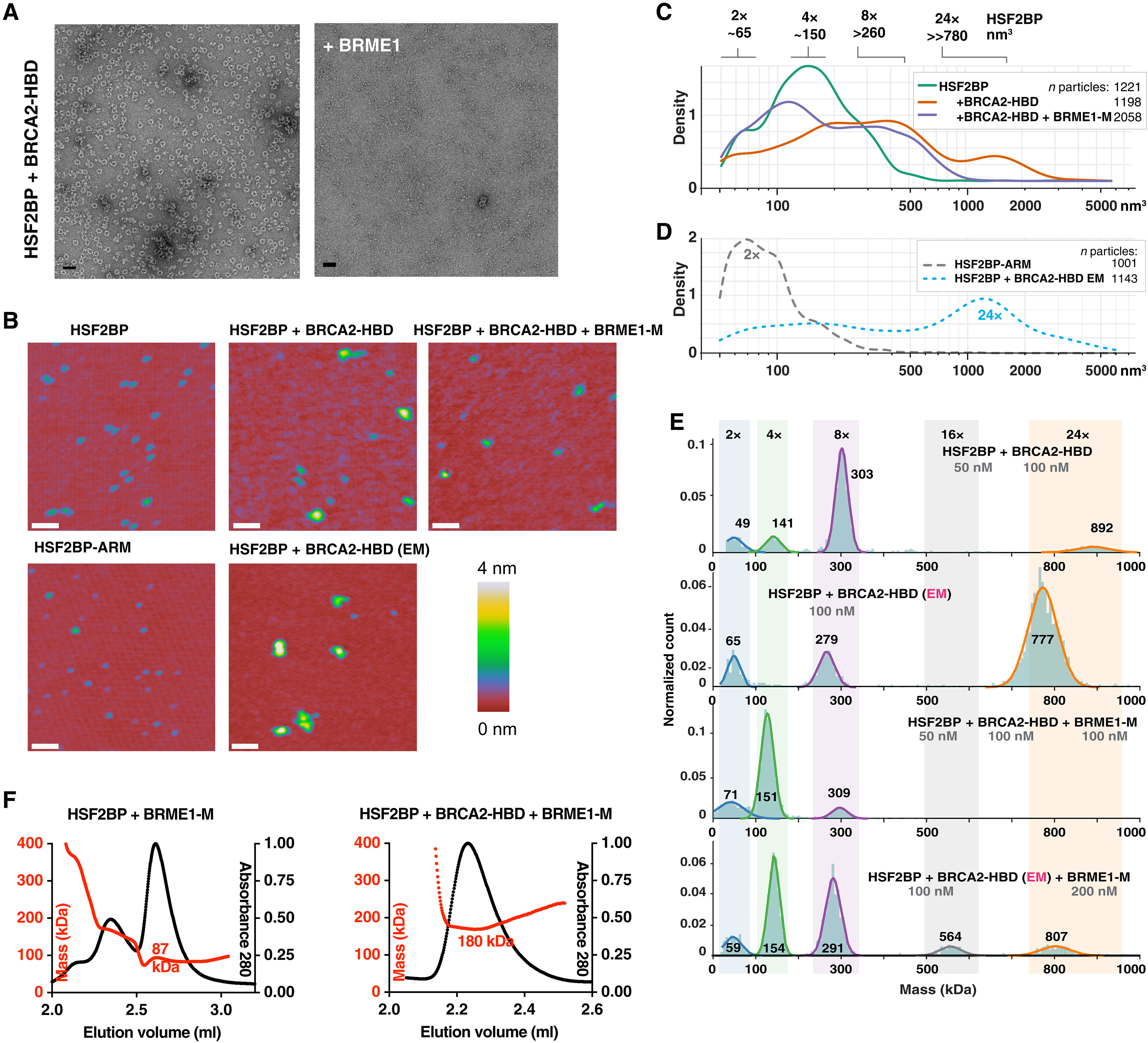 Fig. 5. A BRME1 peptide disrupts the ring-shaped complex. (A) Negative-staining EM images recorded on the complex formed by HSF2BP and BRCA2-HBD in the absence (left) and presence (right) of the peptide BRME1-M. The conditions are the same as in Fig. 2C. (B) Representative SFM images of HSF2BP, its armadillo domain (HSF2BP-ARM), HSF2BP + BRCA2-HBD, and HSF2BP + BRCA2-HBD + BRME1-M. The complexes were assembled just before deposition on mica for SMF analysis. Only the sample prepared for EM was purified by gel filtration. Scale bars, 100 nm. (C) Kernel density plots of the particle volume distributions for HSF2BP and its complexes with BRCA2-HBD and BRCA2-HBD + BRME1-M. The number of particles is indicated in the legend, and the replicate of the experiment is shown in fig. S6 (A and B). (D) Kernel density plots of particle volume distributions of the HSF2BP-ARM fragments and HSF2BP + BRCA2-HBD complexes prepared following the protocol used for EM. These were used to determine the volumes of the dimers and the ring-shaped 24-nucleotide oligomer, respectively. The experiment was done once, and the number of analyzed particles is indicated. (E) Mass photometry experiments performed on HSF2BP in the presence of BRCA2-HBD (freshly assembled or cryo-EM samples) and/or BRME1-M. The distributions of masses are displayed at the indicated concentrations of proteins. The cryo-EM sample was diluted down to 100 nM, and a twofold excess of BRME1-M was used to observe the impact of BRME1-M on the 24-nucleotide oligomer complex. Replicates are presented in fig. S6D. (F) SEC-MALS analysis of the complex between HSF2BP and BRME1-M in the absence (left) or presence (right) of BRCA2-HBD (column: BIOSEC 3). Replicates are presented in fig. S6E. |