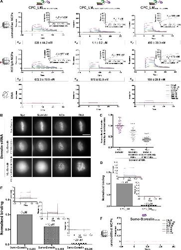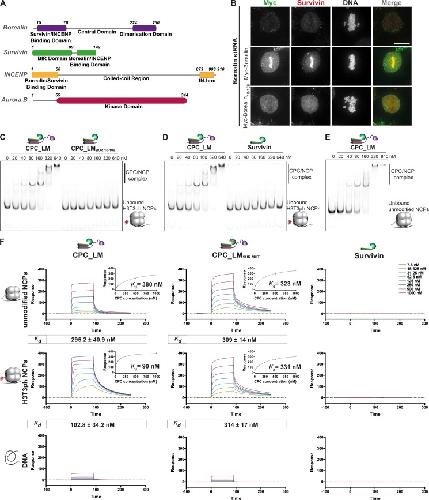 Figure 1. Borealin nucleosome binding is essential for chromosome association of the CPC. (A) Domain architecture of the subunits of the CPC. (B) Representative fluorescence images of a siRNA rescue assay for Borealin10–109 fragment. Immunofluorescent staining of Myc and Survivin in HeLa cells cotransfected with siRNA duplexes targeting the 3′ UTR region of Borealin and Myc-Borealin constructs. Hoechst was used for DNA staining. Scale bar, 10 µm. All cells transfected with the siRNA and Myc-Borealin10–109 fragment showed exclusion of the CPC complex from the chromatin. (C and E) Native PAGE analysis of EMSA assays performed with increasing concentrations of recombinant CPC_LM containing different Borealin fragments and either 20 nM phosphorylated (H3T3ph; C) or unmodified IR700-labeled (E) NCPs. (D) EMSA assays performed with increasing concentrations of Survivin with 20 nM IR700-labeled H3T3ph NCPs. (F) Representative SPR sensorgrams of the interaction between different CPC_LM complexes (CPC_LM, CPC_LMSUR MUT) or Survivin and unmodified (top) or H3T3ph (middle) NPCs or DNA (bottom) immobilized on the surface of a neutravidin sensor chip. Mean values (n ≥ 3, ±SEM) determined for the equilibrium Kd are shown in boxes underneath the sensorgrams. For a detailed description of the CPC domain architecture, refer to Fig. S1 C.