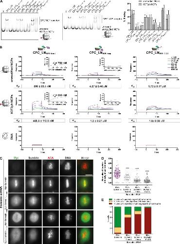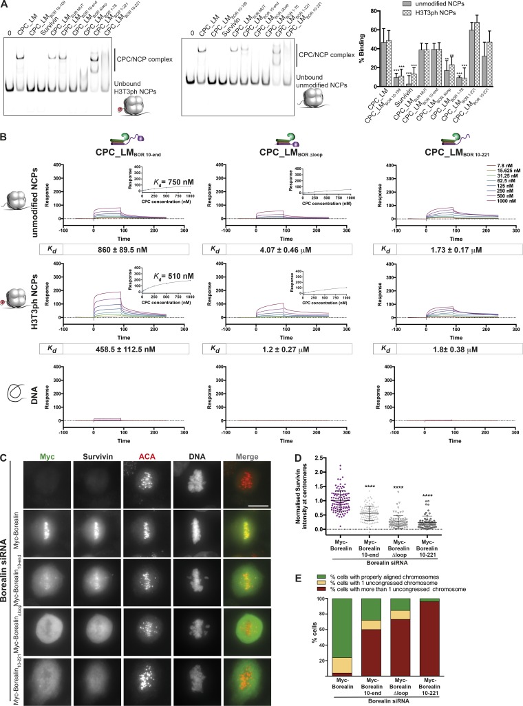 Figure 2. N-terminal nine amino acids and C-terminal half of Borealin are required for CPC–chromatin interaction. (A) Native PAGE analysis of EMSA assays performed with recombinant CPC_LM containing different Borealin truncations binding to IR700-labeled H3T3ph NCPs (left) and unmodified NCPs (middle) and quantification of binding (right). Concentrations of the NCP and the CPC used in the assay were 20 and 160 nM, respectively. Mean of percentage of binding ± SD; n = 5; **, P ≤ 0.01; ***, P ≤ 0.001, unpaired t test. (B) Representative SPR sensorgrams of the interaction between different CPC_LM complexes (CPC_LMBOR 10–end, CPC_LMBOR Δloop, and CPC_LMBOR 10–221) and unmodified (top) or H3T3ph (middle) NCPs or DNA (bottom). Mean values (n ≥ 3, ±SEM) determined for the equilibrium Kd are shown in boxes underneath the sensorgrams. For a detailed description of the CPC domain architecture, refer to Fig. S1 C. (C) Representative fluorescence images of a rescue assay for Borealin, Borealin10–end, BorealinΔloop, and Borealin10–221 constructs. Immunofluorescent staining of Myc, Survivin, and ACA in HeLa cells cotransfected with siRNA duplexes targeting the 3′ UTR region of Borealin and Myc-Borealin constructs. Hoechst was used for DNA staining. Scale bar, 10 µm. (D) Quantification of Survivin levels at the centromeres for the siRNA-rescue assays with Myc-Borealin (n = 111 cells), Myc-Borealin10–end (n = 101 cells), Myc-BorealinΔloop (n = 85 cells), and Borealin10–221 (n = 72 cells) shown in C (three independent experiments, mean ± SEM, Mann–Whitney U test; ****, P < 0.0001). (E) Quantification of uncongressed chromosomes observed for the siRNA-rescue assay of Myc-Borealin, Myc-Borealin10–end, Myc-BorealinΔloop, and Myc-Borealin10–221 fragments shown in C. A minimum of 25 cells were counted for each construct.