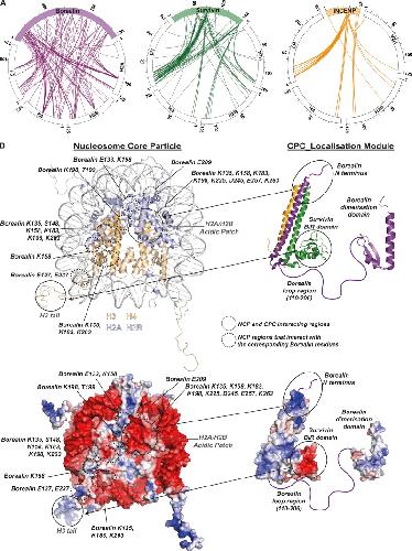 Figure 3. CPC–nucleosome binding is mediated by multivalent interactions predominantly involving Borealin. (A) Circle view of the cross-links observed between the subunits of the CPC (Borealin, purple; Survivin, green; INCENP, yellow) and histones from unmodified NCPs. Intermolecular contacts involving Borealin, Survivin, and INCENP and histones are shown as purple, green, or yellow lines, respectively, using XiNET (Kolbowski et al., 2018). (B) Cartoon representation of the crystal/NMR structures of the NCP (PDB: 1KX5; Davey et al., 2002) and CPC (CPC core PDB: 2QFA [Jeyaprakash et al., 2007] and Borealin dimerization domain PDB: 2KDD [Bourhis et al., 2009]; top). Surface representation of the NCP and the CPC colored based on the electrostatic surface potential calculated using APBS in Pymol v2.0.6 (bottom).