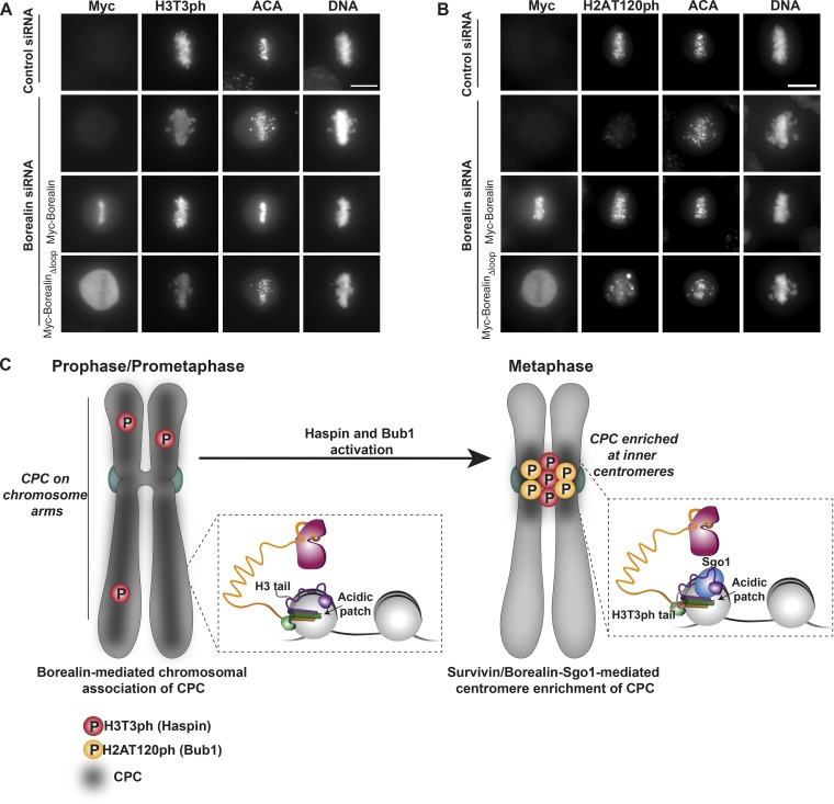 Figure 5. Borealin-mediated chromosome association of the CPC is an upstream requirement for its Haspin- and Bub1-mediated centromeric enrichment. (A and B) Immunofluorescence analysis of ACA and H3T3ph (A) or H2AT120ph (B) levels upon Borealin depletion using siRNA duplexes and rescue with different Borealin constructs. Hoechst was used for DNA staining. Scale bar, 10 µm. (C) Model for Borealin-mediated chromatin association of the CPC and subsequent centromere enrichment. Considering that Borealin can dimerize and is required for efficient NCP binding, we speculate that two copies of CPC likely bind symmetrically equivalent CPC-interaction sites on NCP. For clarity, just one CPC binding is shown in the cartoon.