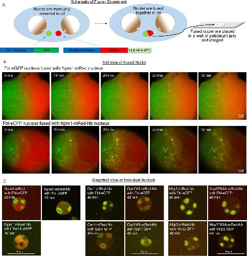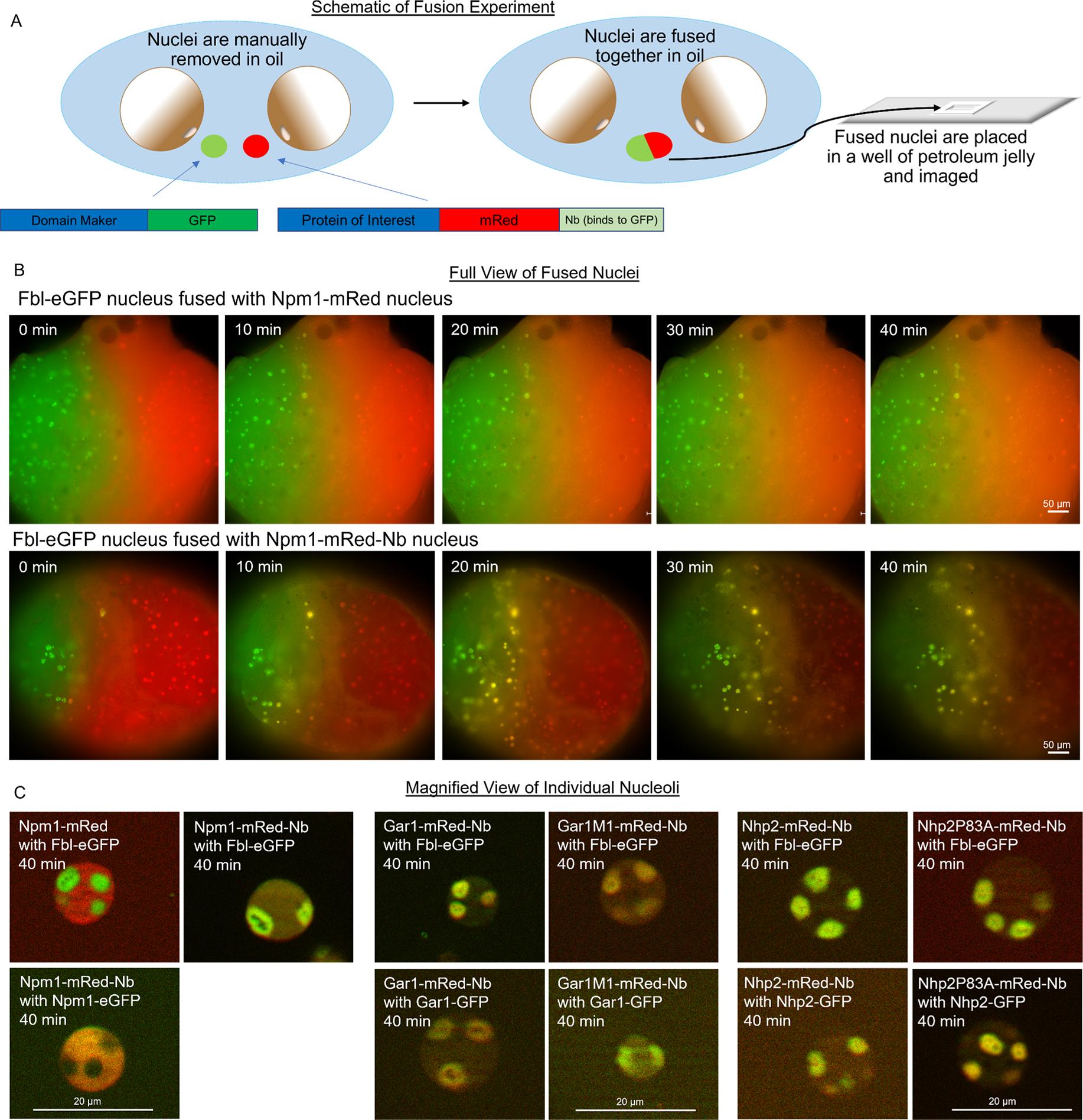 (A) Schematic of nuclear fusion experiments, showing nuclei being isolated in mineral oil; 2 nuclei, each expressing different fluorescently tagged proteins, being fused together; then fused nuclei being added to a microscope slide in a well of petroleum jelly for imaging. (B) Fluorescent images taken in 10-min intervals showing the diffusion of the fluorescently tagged proteins from 1 nucleus to the nucleus it is fused with. The top row shows a nucleus containing Fbl-eGFP fused with a nucleus containing Npm1-mRed. The second row shows a nucleus with Fbl-eGFP fused with a nucleus expressing Npm1-mRed-Nb. Scale: 50 μm. (C) Representative Apotome fluorescent images of nuclei found at the junction of the fused nuclei after 40 min for the proteins indicated on each image. For each condition in Fig 4, 35+ nucleoli were observed from each of 3 different injection days, representative images are shown here. Scale: 20 μm.