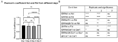 (A) Statistical analysis using Pearson’s Coefficient to assess the overlap of fluorescently tagged Ncl co-expressed with fluorescently tagged Fbl on 4 different days using one-way ANOVA multiple comparisons test, p < 0.05. N = 15, 58, 52, and 24 for days 1–4 respectively. (B) Table showing the results of the statistical analysis comparing the coefficients of variations of the conditions indicated in the left column. Replicates “1, 2, and 3” indicate different frogs/injection days for each condition. Values from columns are not necessarily from the same day (data should be read horizontally and not vertically). P < 0.05, N values between 15–62. The underlying data can be found in S2 Data.