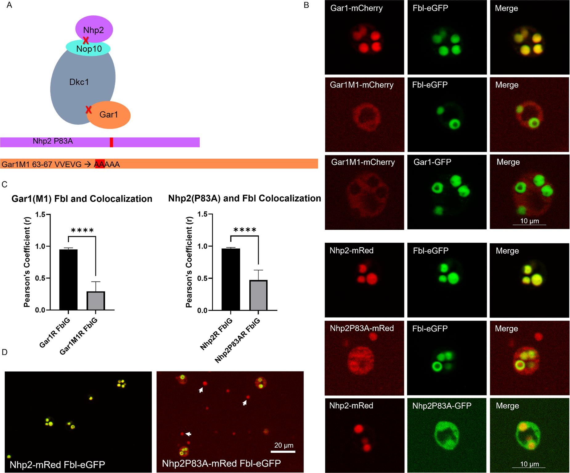 (A) Model of the general layout of the box H/ACA complex proteins and a schematic showing the mutation sites to disrupt binding. (B) Representative images of nucleoli expressing wild-type Gar1-mCherry and Gar1 with a mutated binding site to DKC1 (Gar1M1-mCherry) along with the DFC marker Fbl-eGFP. Also shown are wild-type Nhp2-mRed and Nhp2 with a point mutation that disrupts its binding to Nop10 (Nhp2P83A-mRed) with DFC marker Fbl-eGFP. Isolated nuclei were incubated in OR2 for 20 min prior to imaging. Scale: 10 μm. (C) Quantification of the colocalization of Gar1M1-mCherry or Gar1-mCherry with Fbl-eGFP and of Nhp2-RFP or Nhp2P83A-RFP with Fbl-eGFP shown with Pearson’s coefficient. Significance was determined using a t test (p < 0.05) with N = 30 (Gar1) and 26 (Gar1M1) for the Gar1 set and N = 24 (Nhp2) and 21 (Nhp2P83A) for the Nhp2 set. These experiments were repeated with nucleoli from the oocytes of 3 different frogs and were significant each time. The underlying data can be found in S1 Data. (D) Images of Nhp2-mRed and Nhp2P83A-mRed showing extra-nucleolar deposits of Nhp2P83A (arrows) that were not present for the wild type. Scale: 20 μm. DFC, dense fibrillar component.
