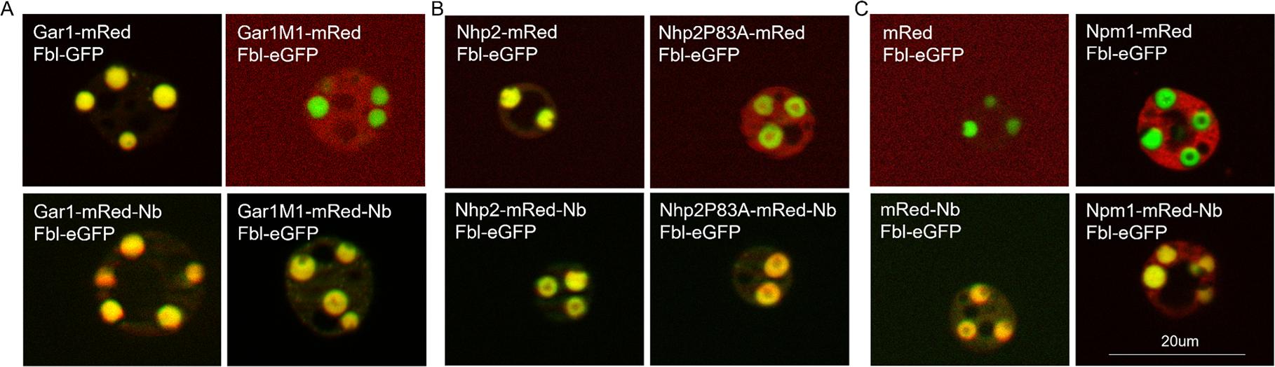 (A) Representative nucleoli from oocytes expressing Gar1 and Gar1M1 nucleolar localization and the same proteins fused with a GFP nanobody (Nb). These proteins were all fused with a red fluorescent protein and were co-expressed with Fbl-eGFP, a DFC marker. (B) Nhp2 and Nhp2P83A with and without nanobody fusion co-expressed with Fbl-eGFP. (C) The localization of a monomeric fluorescent protein (mRed) and Npm1 bound to the GFP nanobody, co-expressed with Fbl-eGFP. For each condition in Fig 3, 35+ nucleoli were observed from each of 3 different injection days, representative images are shown here. Scale: 20 μm. DFC, dense fibrillar component.