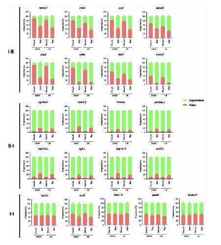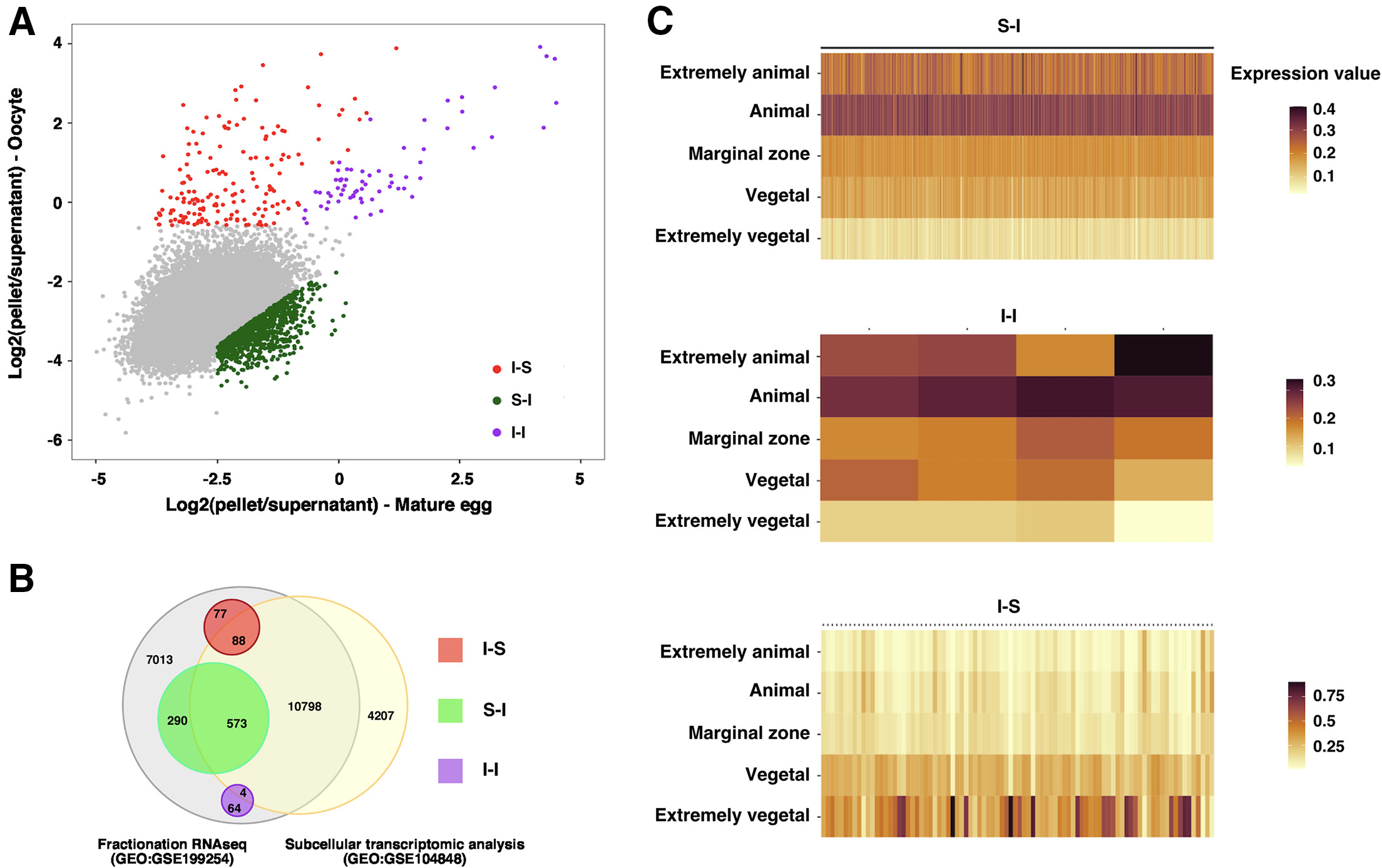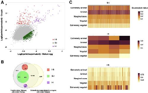 Figure 1. Solubility phase transition of RNA during oocyte maturation (A) Scatter plot shows the pellet to the supernatant ratio in the oocyte (Y-axis) and mature egg (X-axis). I-S transcripts (red) were defined as transcripts enriched by more than 40% in the oocyte pellet fraction and reduced by more than 25% in the pellet fraction after oocyte maturation. I-I transcripts (magenta) were defined as those transcripts enriched by more than 40% in the oocyte pellet fraction, excluding those belonging to the I-S group. S-I transcripts (green) were defined as a more than 2-fold increase in the pellet fraction of mature eggs after oocyte maturation and more than 15% pellet enrichment. (B) Venn diagram shows the overlapping relationship between the fractionation RNA-seq (GEO:GSE199254) and subcellular transcriptomic analysis (GEO:GSE104848). (C) Heat maps show the distribution of S-I, I-I, and I-S transcripts along the animal-vegetal axis. |