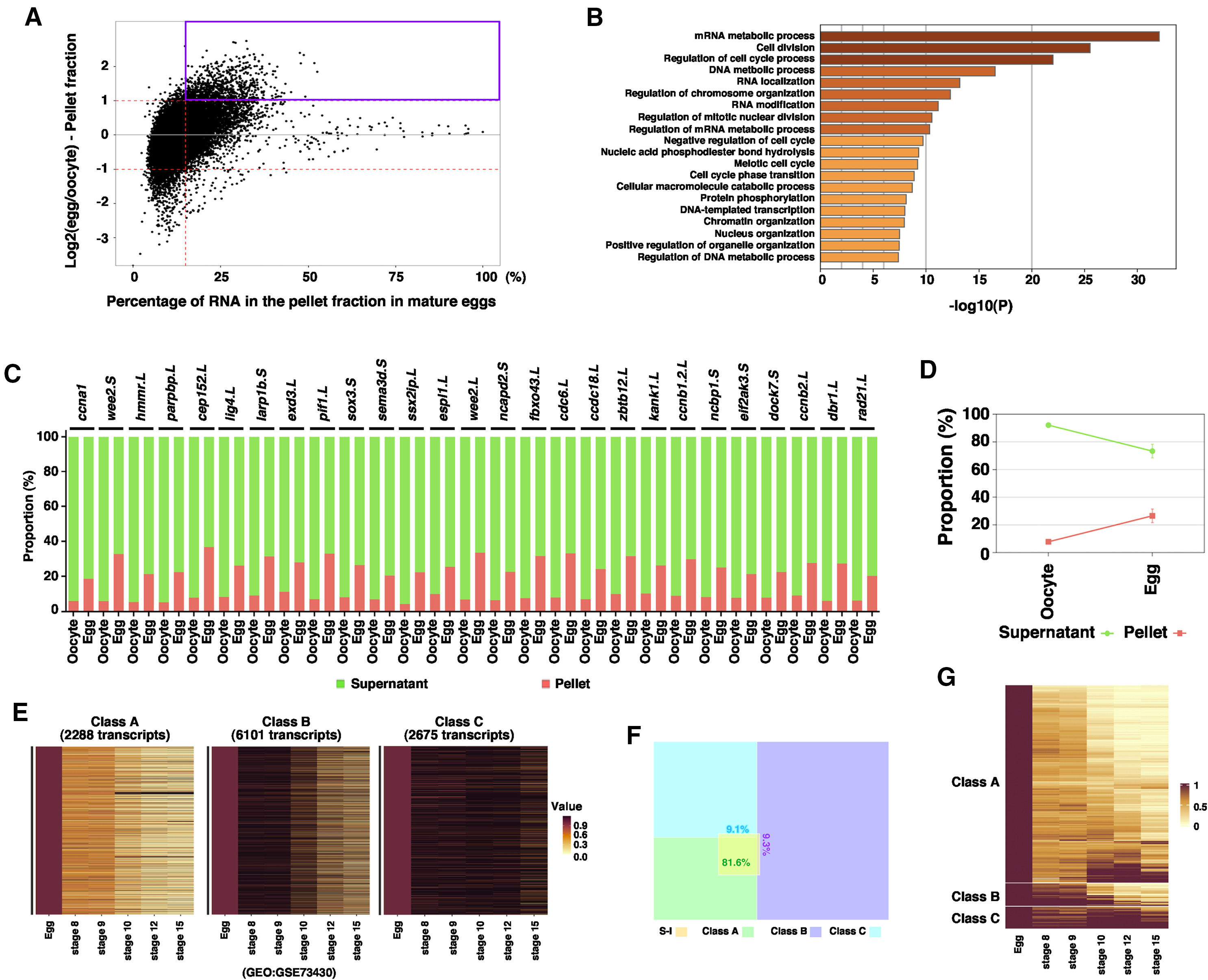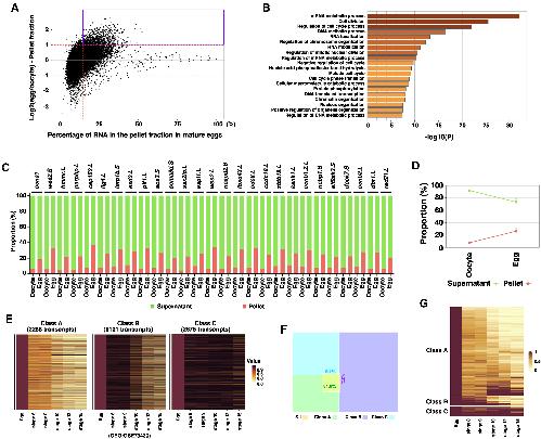 Figure 2. Soluble-to-insoluble phase transition of RNA during oocyte maturation (A) MA plot shows the percentage of RNA in the pellet fraction in the mature egg (X-axis) and the ratio between the RNA in the pellet fraction of the egg and that of the oocyte (Y-axis). S-I transcripts are highlighted in the magenta box. (B) Gene ontology analysis demonstrates the top biological processes that are enriched among S-I transcripts. (C) Fractionation RT-qPCR was performed to validate fractionation RNA-seq results. The percentage distribution of ccna1, wee2.S, hmmr.L, parpbp.L, cep152.L, lig4.L, larp1b.S, exd3.L, pif1.L, sox3.S, sema3d.S, ssx2ip.L, espl1.L, wee2.L, ncapd2.S, fbxo43.L, cdc6.L, ccdc18.L, zbtb12.L, kank1.L, ccnb1.2.L, ncbp1.S, eif2ak3.S, dock7.S, ccnb2.L, dbr1.L, and rad21.L in the supernatant and pellet fractions were calculated. (D) The percentage distribution of all markers analyzed in (C) was combined and plotted into the graph. (E) Heat maps show the classification of maternal transcripts based on their degradation during the MZT. Class A transcripts are most rapidly degraded. Class B transcripts are degraded relatively slowly. Class C transcripts are relatively stable during early development. (F) Venn diagram shows the majority of S-I transcripts belong to class A. (G) Heatmap shows the expression of S-I RNAs during early embryonic development. |