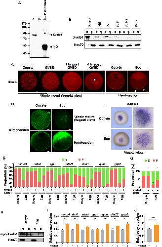 Figure 4. Turnover of Xvelo1 during oocyte maturation results in the solubilization of germline RNAs (A) Xvelo1 protein is enriched in the insoluble fraction in the oocyte. Oocytes were lysed in NP-40 lysis buffer. After centrifugation, the lysate was separated into the supernatant (S) and pellet (P). Supernatant prepared from 10 oocytes was incubated with an anti-Xvelo1 antibody to enrich Xvelo1 in the soluble fraction. The supernatant, pellet, and IP samples were mixed with SDS sample buffer and subjected to western blotting. (B) The expression of Xvelo1 in the oocytes, ovulated eggs, and embryos at stages 1, 6, 8.5, and 10 was analyzed by western blot. (C) The expression of Xvelo1 during oocyte maturation was analyzed by IF. White arrowheads point to Xvelo1 remaining in the vegetal pole in mature eggs. The scale bars indicate 100 μm. (D) Oocytes and mature eggs of the Dria transgenic frogs, which carry a mitochondria-specific GFP transgene, were stained with an anti-GFP antibody. The scale bars indicate 100 μm. (E) Whole mount in situ results show nanos1 transcripts are located in punctate aggregates in the vegetal of the oocyte. After oocyte maturation, nanos1 transcripts show a diffuse appearance, with only a small number of puncta remaining in the vegetal pole. The scale bars indicate 200 μm. (F and G) Overexpression of Xvelo1 prevents solubilization of germline RNAs after oocyte maturation. Oocytes were injected with 2 ng of myc-Xvelo1 RNA, and cultured for 2 days, followed by progesterone treatment. Fractionation RT-qPCR was performed to assess the phase transition of nanos1, xdazl, pgat, ddx25, dnd1, sybu, and grip2 (F). (G) is the combination of all germline RNAs analyzed in (F). (H) Myc-Xvelo1 RNA injected oocytes were cultured normally or treated with progesterone. Oocytes and mature eggs were fractionated and analyzed for the expression of myc-Xvelo1 and endogenous Hsc70 by western blotting. (I and J) Control and Xvelo1 injected oocytes were used to generate embryos via the host-transfer technique. At stage 11.5, embryos derived from control and Xvelo1 injected oocytes were harvested to assess the expression of nanos1, xdazl, pgat, ddx25, dnd1, sybu, and grip2. (J) is the combination of all markers analyzed in (I). Student t tests were performed. ∗∗ p < 0.01, ∗∗∗ p < 0.001, ∗∗∗∗p < 0.0001. |