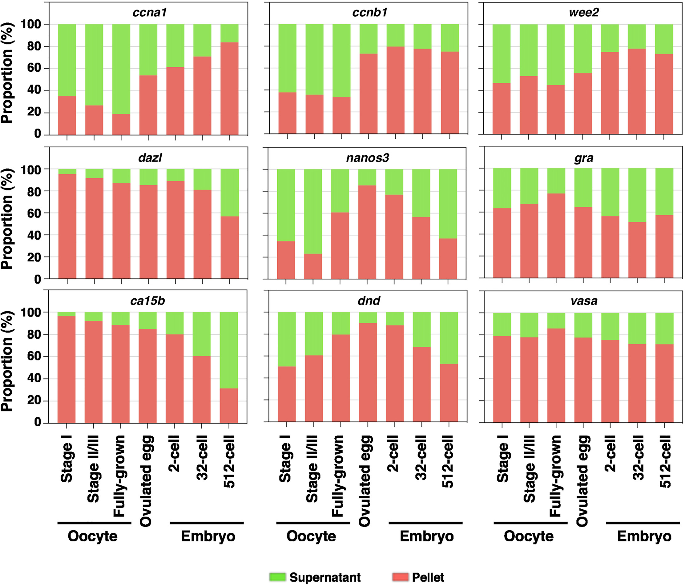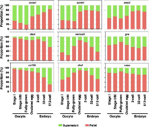 Figure 7. RNA phase transition during zebrafish OET Fractionation RT-qPCR was performed to measure the percentage distribution of ccna1, ccnb1, wee2, dazl, nanos3, gra, ca15b, dnd, and vasa in stage I, stage II/III, and fully grown oocytes, ovulated eggs, and embryos at 2-, 32-, and 512-cell stages. |