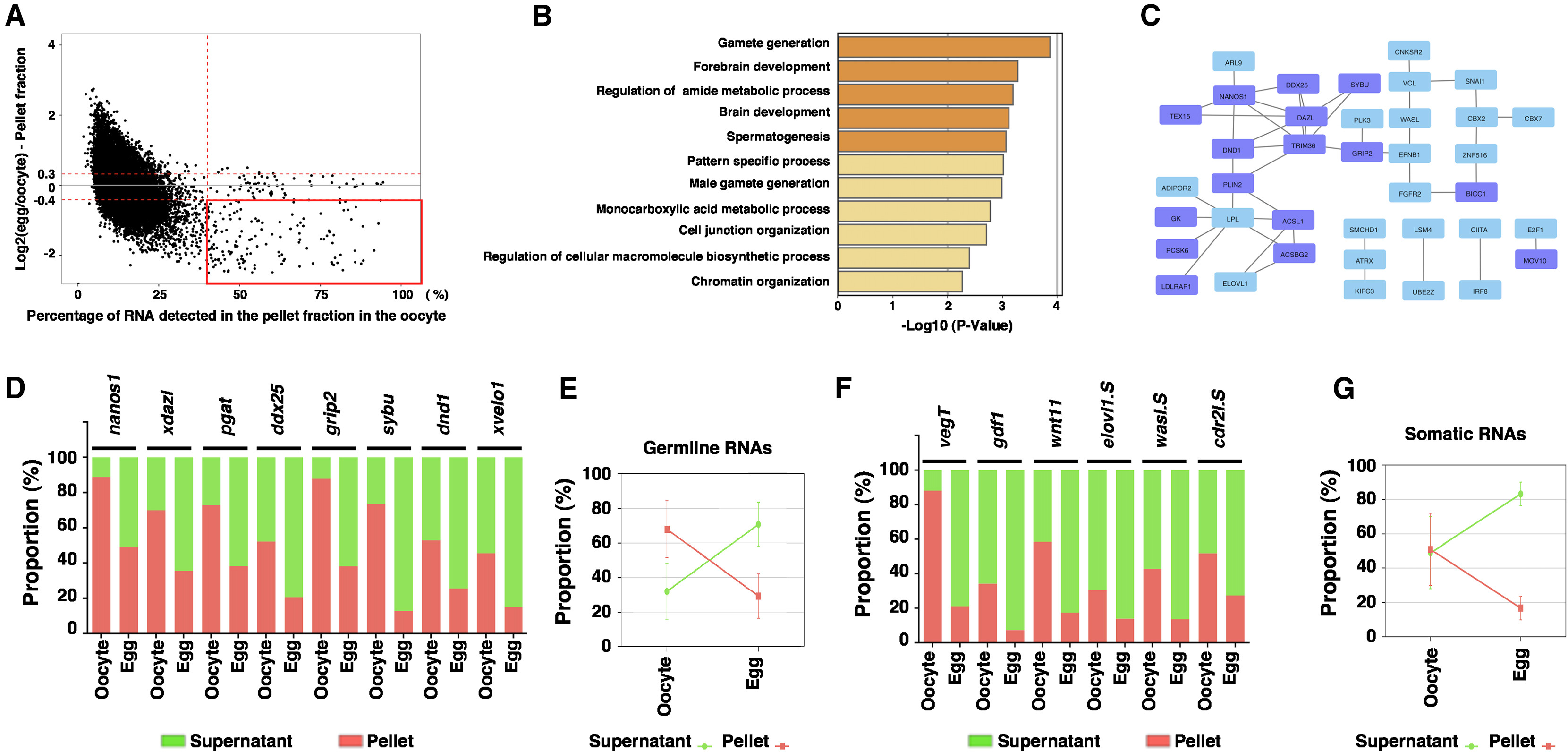 Figure 3. Insoluble-to-soluble phase transition of RNA during oocyte maturation (A) MA plot shows the percentage of RNA in the pellet fraction in the oocyte (X-axis) and the ratio between the RNA in the pellet fraction of the egg and that of the oocyte (Y-axis). I-S transcripts are highlighted in the red box. (B) Gene ontology analysis demonstrates the top biological processes that are enriched among I-S transcripts. (C) Protein-protein interaction (PPI) map shows the transcripts selected from a red box in (A). This PPI shows only proteins interacting with at least one or more other proteins. Purple boxes indicate germline transcripts. (D–G) Fractionation RT-qPCR was performed to validate fractionation RNA-seq results. (D) The percentage distribution of germline I-S RNAs, including nanos1, xdazl, pgat, ddx25, grip2, sybu, dnd1, and xvelo1 in the supernatant and pellet fractions, were calculated. (E) The percentage distribution of all germline RNAs analyzed in (D) was combined and plotted into the graph. (F) The percentage distribution of somatic I-S RNAs, including vegT, gdf1, wnt11, elov11.S, wasl.S, and cdr2l.S in the supernatant and pellet fractions, were calculated. (G) The percentage distribution of all somatic I-S RNAs analyzed in (F) was combined and plotted into the graph. |