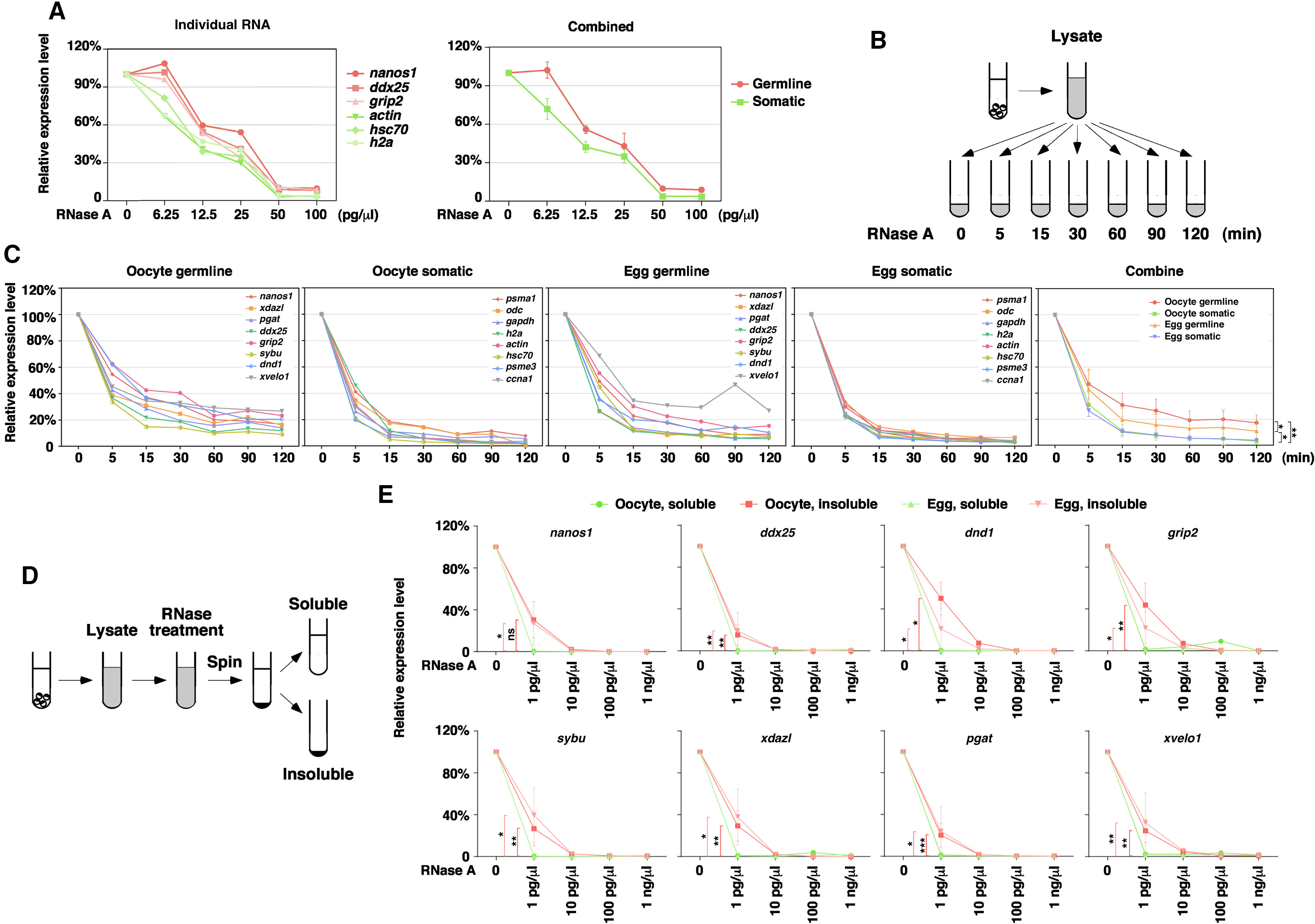 Figure 5. Insoluble germline RNAs are resistant to RNase A in vitro (A) Crude oocyte lysate was treated with various doses of RNase A. After RNase A treatment, RNA was extracted for RT-qPCR. The level of nanos1, ddx25, grip2, actin, hsc70, and h2a was measured. RNA from untreated lysate was set as 100%. (B) Schematic diagram shows the procedure for the experiments in (C). (C) Crude oocyte lysate was treated with 12.5 pg/μL RNase A for various amounts of time. Degradation kinetics of germline (nanos1, xdazl, pgat, ddx25, grip2, sybu, dnd1, and xvelo1) and somatic (psma1, odc, gapdh, h2a, actin, hsc70, psme3, and ccna1) RNAs were measured by RT-qPCR. The expression of each germline and somatic RNAs in the oocyte and the mature egg was shown individually. The panel on the right side is the combination of all germline and somatic RNAs in the oocyte and egg. Two-way RM ANOVA tests were performed (oocyte germline vs. oocyte somatic: F(1,7) = 26.8, p = 0.0013; egg germline vs. egg somatic: F(1,7) = 6.24, p = 0.0411; oocyte germline vs. egg germline: F(1,7) = 8.85, p = 0.0207; oocyte somatic vs. egg somatic: F(1,7) = 0.62, p = 0.4544), ∗p < 0.05, ∗∗p < 0.01. (D) Schematic diagram shows the procedure of experiments in (E). (E) Crude lysate was treated with RNase A, separated into the soluble and insoluble fractions, followed by RT-qPCR for nanos1, xdazl, pgat, ddx25, grip2, sybu, dnd1, and xvelo1. Ratio-paired t tests at 1 pg/μL were performed. ∗p < 0.05, ∗∗p < 0.01, ∗∗∗p < 0.001. |