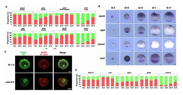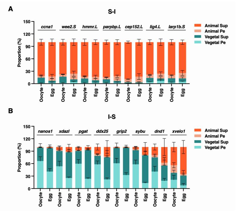 S-Fig 2. Solubility phase transition of RNAs along the animal-vegetal axis, related to Figure 1. Oocytes and mature eggs were dissected into animal and vegetal halves for fractionation RTqPCR. A and B show the percentage distribution of I-S RNAs (nanos1, xdazl, pgat, ddx25, grip2, sybu, dnd1, and xvelo1), S-I RNAs (ccna1, wee2, hmmr.L, parpbp.L, cep152.L, lig4.L, and larp1b.S). |