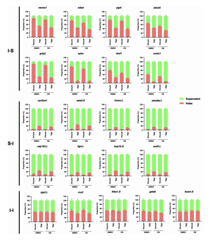 S-Fig3. RNA phase transition occurs independent of ER remodeling during the OET, related to Figure 1. Control and cytochalasin B (CB)-treated oocytes and mature eggs were subjected to fractionation RT-qPCR. The percentage distribution of I-S RNAs (nanos1, xdazl, pgat, ddx25, grip2, sybu, dnd1, and xvelo1), S-I RNAs (ccna1, wee2, hmmr.L, parpbp.L, cep152.L, lig4.L, larp1b.S, and exd3.L). and I-I RNAs (rgs2.L, rnu2, thbs1.S, gata6, and bcam.S) was analyzed. |