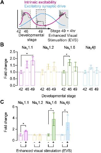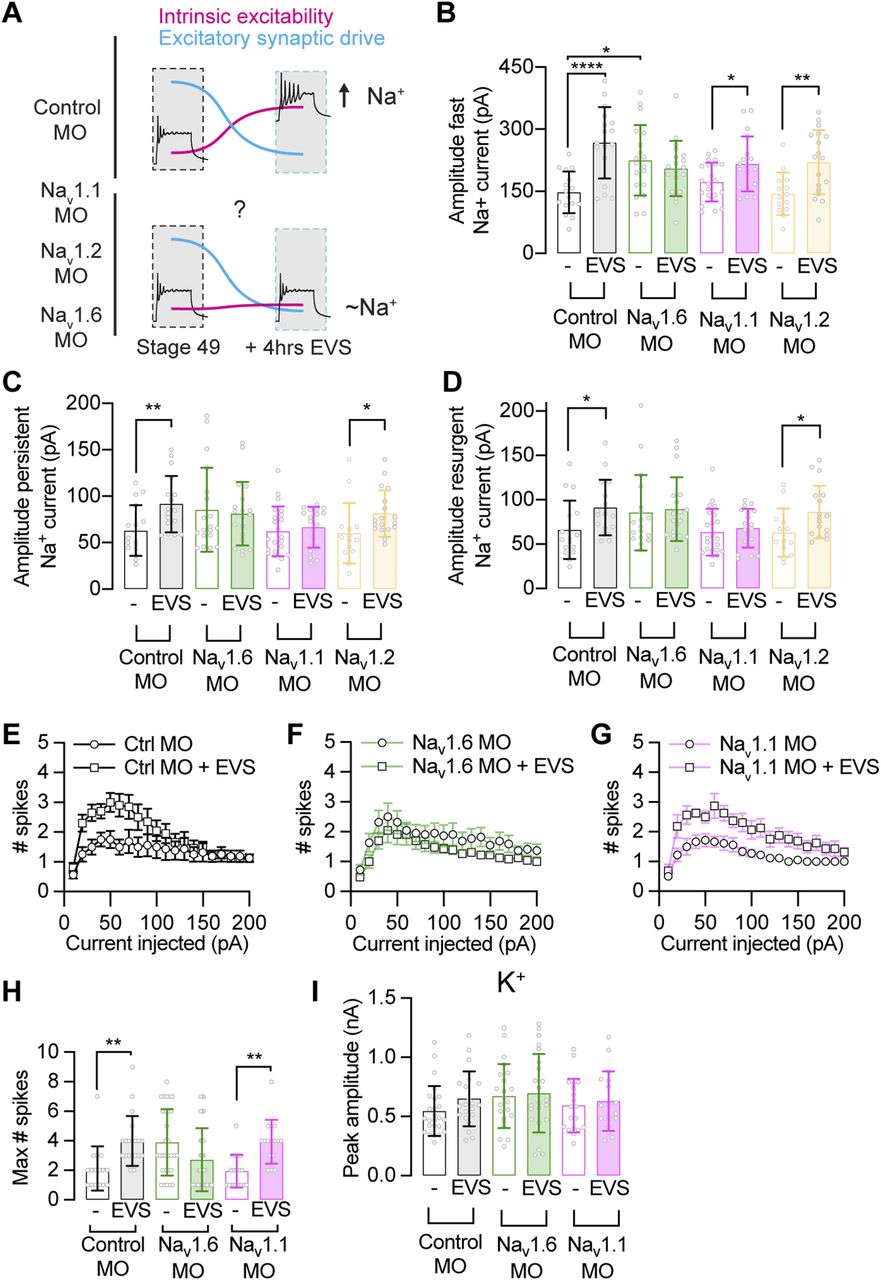 Figure 6. Knockdown of Nav1.6 attenuates network activity-dependent homeostatic increase in Na+ currents. (A) Schematic illustrates how exposure of stage 49 tadpoles to 4 h of enhanced visual stimulation (EVS) decreases excitatory synaptic drive and triggers a compensatory increase in intrinsic excitability via an increase in Na+ currents. (B, C, D) Quantification showing the effect of acute knockdown of expression of specific Nav channel subtypes on the EVS-triggered increases in the amplitude of the fast, persistent, and resurgent Na+ currents. Comparisons between experimental groups are presented in Table S3 (n = 16–22 cells). (E, F, G, H) Exposure of stage 49 tadpoles to 4 h of EVS triggers an increase intrinsic excitability, which is attenuated by the suppression of Nav1.6 channel expression, but not Nav1.1 channel expression (n = 16–31 cells). (I) K+ currents are not regulated with EVS-induced increases in intrinsic excitability. Comparisons between experimental groups are presented in Table S4. Groups were compared using a Welch’s ANOVA test with Dunnett T3 test for multiple comparisons. |