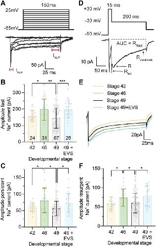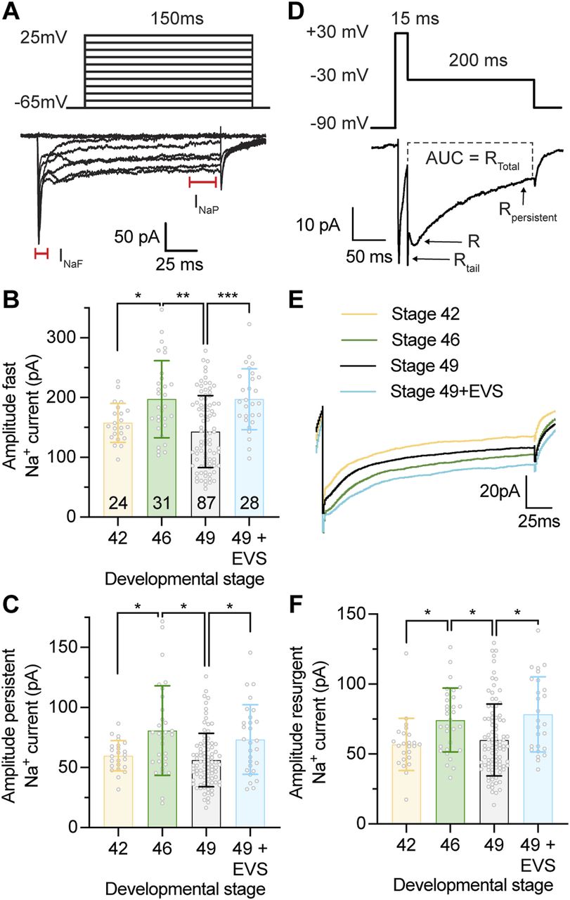 Figure 3. Tectal neurons express fast and persistent voltage-gated Na+ currents that are regulated with developmental and homeostatic changes in intrinsic excitability. (A) Example voltage-clamp recordings from a tectal neuron held at −65 mV in response to a series of 150 ms depolarizing steps (−65 to 25 mV) using a Tris-based internal saline solution, which blocks outward K+ currents to reveal distinct fast and persistent Na+ currents. Recordings are leak subtracted to show only active currents. Fast (INaF) and persistent (INaP) Na+ currents are indicated on the recording. (B, C) Quantifications of peak amplitudes for the fast and persistent Na+ currents. (B) Fast Na+ current ([in pA] Stage 42: 157.7 ± 32.5; Stage 46: 197.3 ± 64.4; Stage 49: 143.1 ± 60.3; Stage 49 + enhanced visual stimulation [EVS]: 197.4 ± 50.9). (C) Persistent Na+ current ([in pA] Stage 42: 59.8 ± 12.5; Stage 46: 80.7 ± 37.3; Stage 49: 56.3 ± 22.3; Stage 49 + EVS: 73.4 ± 29.0). (D) Example resurgent current recording from a tectal neuron held at −65 mV that was hyperpolarized to −90 mV for 500 ms before stepping to +30 mV for 15 ms to open voltage-gated Na+ channels. Resurgent Na+ currents were then recorded by a repolarizing step to −30 mV for 200 ms, which revealed distinct tail resurgent (RTail), resurgent (R) and persistent resurgent (RPersistent) currents. Recordings were obtained using a Tris-based internal saline solution to block outward K+ currents, and leak subtracted to show only active currents. (E) Averaged resurgent current traces obtained from tectal neurons between developmental stages 42–49, and at stage 49 after exposure to 4 h of EVS. (F) Peak resurgent current amplitude across development and in response to 4 h of EVS ([in pA] Stage 42: 55.9 ± 18.6; Stage 46: 74.3 ± 22.8; Stage 49: 60.0 ± 25.7; Stage 49 + EVS: 78.4 ± 26.9). Groups were compared using a Welch’s ANOVA test with Dunnett T3 test for multiple comparisons. (D) n values are shown in (D). |