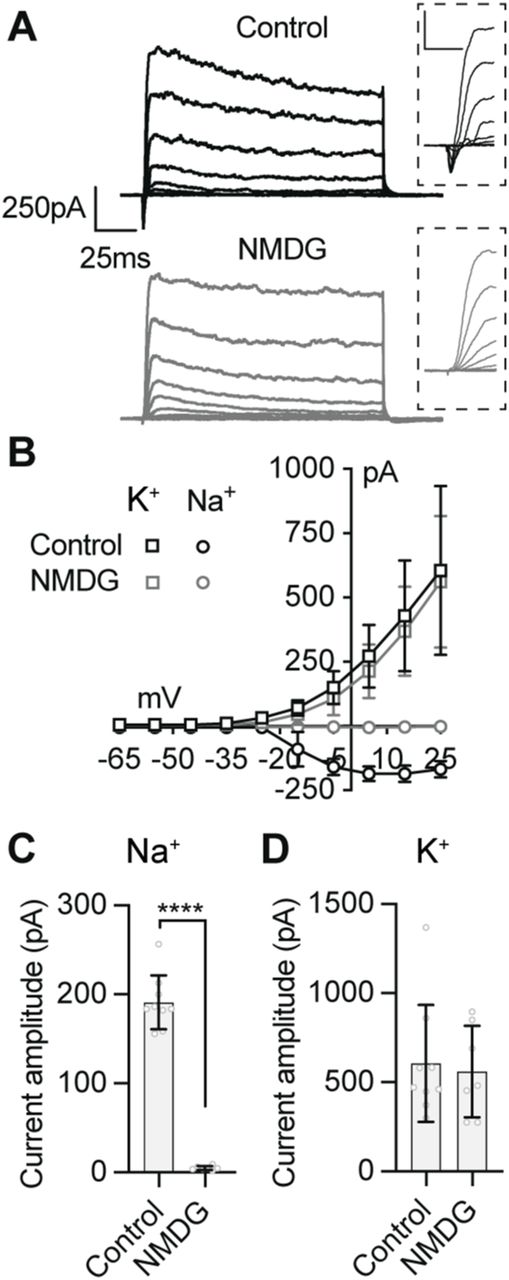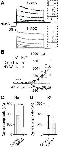 Figure S4. Removal of external Na+ specifically inhibits Na+ influx without affecting K+ currents. (A) Example voltage-clamp recordings with a K+-based internal saline in control and Na+ deficient (NMDG) external saline solutions. Magnifications of the initial 30 ms of each trace illustrate how Na+ and K+ currents are temporally isolated in mixed current recordings. (B) I–V plot illustrates the specific effect of removing external Na+ ions on the Na+ currents (circles), sparing the K+ current (squares). (C, D) Quantification of the effect of NMDG external on Na+ currents and K+ currents (****P < 0.0001, n = 7–9 cells). |