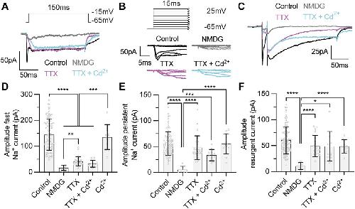 Figure 4. The persistent and resurgent Na+ currents, but not the fast Na+ current, are insensitive to tetrodotoxin (TTX). (A, B, C) Example voltage-clamp recordings from tectal neurons with a Tris-based internal solution to isolate Na+ currents from stage 49 tectal neurons in control conditions (black), in zero Na+ external solution (NMDG) to block all inward Na+ currents (grey), in 1 µM TTX to block TTX-sensitive Na+ currents (magenta), or in 100 nM Cd2+ to block Ca2+ currents (cyan). (A) Example recordings show fast and persistent from a single depolarizing step to −15 mV for each experimental group. (A, B) Magnification of the initial 15 ms of the recordings shown in (A) to a series of voltage steps (−65 to +25 mV) to highlight the effect of each treatment on the fast Na+ current. Note that TTX attenuates fast but not persistent Na+ currents, whereas blocking all Na+ influx by replacing external Na+ with NMDG attenuates both fast and persistent currents to reveal a small, presumptive Ca2+ current. (C) Example recordings illustrating the effect of each condition on the resurgent Na+ current. (D, E, F) Quantification of peak amplitudes for the (D) fast, (E) persistent, and (F) resurgent Na+ currents for each experimental group. Groups were compared using a Welch’s ANOVA test with Dunnett T3 test for multiple comparisons. n values for (D, E, F) were 87 stage 49 controls, 15 NMDG, 27 TTX, 11 TTX + Cd2+, and 12 Cd2+. Values and comparisons are shown in Table S2. |