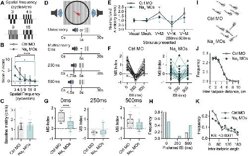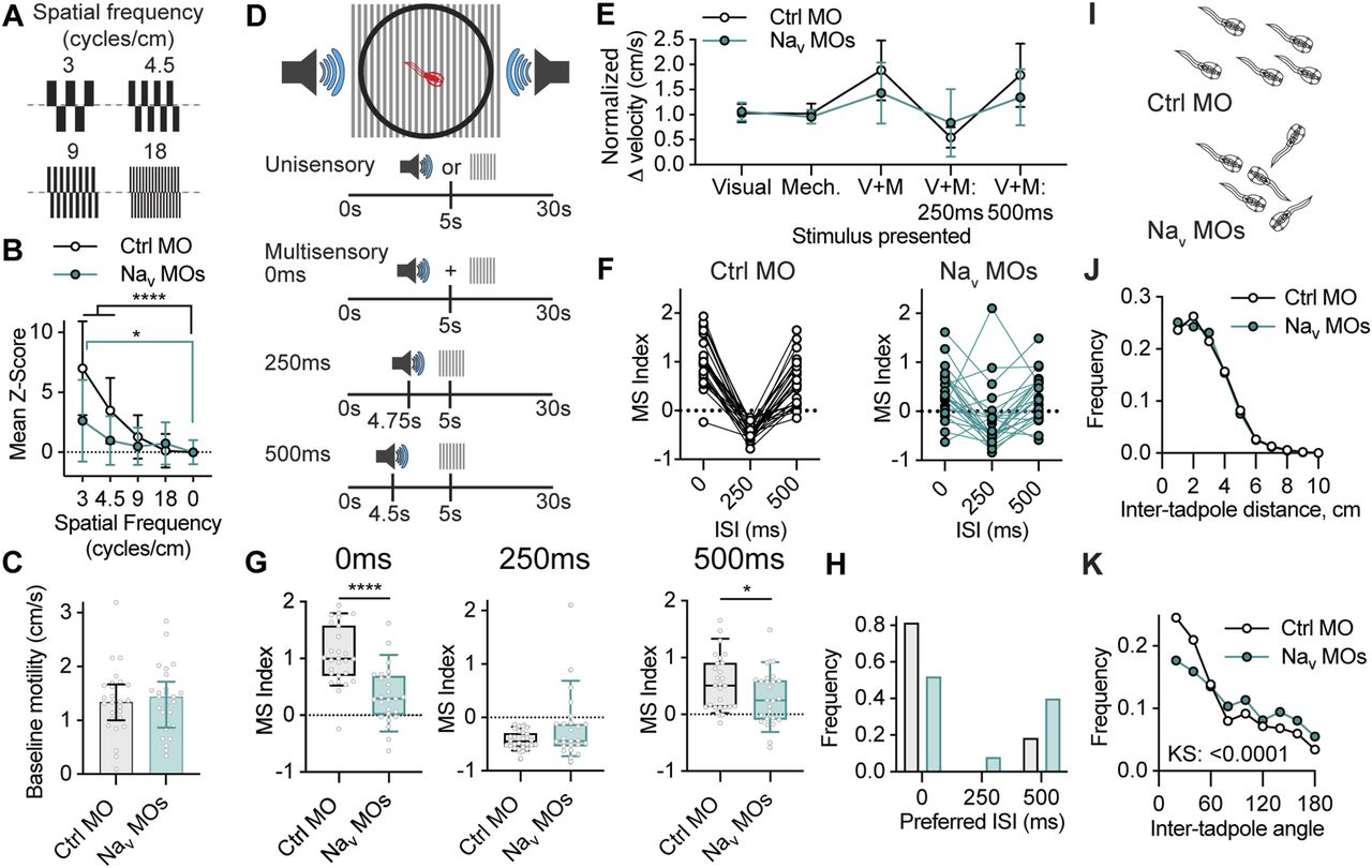 Figure 7. Tadpoles in which expression of Nav1.1 and 1.6 was perturbed during tectal circuit development show impairments in visual acuity, multisensory integration, and schooling behaviors. Effect of knocking down of Nav1.1 and Nav1.6 expression at stages 44–46 on tadpole behavior at stage 49 (comparisons showing that knockdown of Nav1.1 and Nav1.6 expression treatment had no effect on Na+ currents at stage 49 are presented in Table S5). (A, B, C) Effect of developmental knockdown of Nav expression on visual acuity behavior. (A) Control morpholino (Ctrl MO) or Nav1.1/Nav1.6 morpholino (Nav MO) tadpoles were exposed to gratings counterphasing at 4 Hz over a range of spatial frequencies (3, 4.5, 9, and 18 cycles/cm). (B) Knockdown of Nav1.1 and Nav1.6 during the critical period of tectal development impaired responses to low spatial frequencies. Ctrl MO. 3 cycles/cm: 7.0 ± 3.9 (P < 0.0001), 4.5 cycles/cm: 3.5 ± 2.7 (P < 0.0001), 9 cycles/cm: 1.3 ± 1.8 (P = 0.1238), 18 cycles/cm: 0.1 ± 1.4 (P = 0.8330). Nav MO. 3 cycles/cm: 2.6 ± 3.4 (P = 0.0107), 4.5 cycles/cm: 1.0 ± 2.0 (P = 0.9059), 9 cycles/cm: 0.5 ± 1.6 (P = 0.9056), 18 cycles/cm: 0.7 ± 1.8 (P = 0.5767). N = 7 experiments of 3–4 animals. Groups were compared using a two-way ANOVA test with Holm–Sidak test for multiple comparisons. (C) This effect of Nav knockdown on visual acuity was not caused by a change in motility (Ctrl MO: 1.34, IQR = 1.00–1.67; Nav MO: 1.44, IQR = 0.87–1.72; P = 0.8886, n = 25–27 animals). Groups compared using a Mann–Whiney U test. (D, E, F, G, H) Effect of developmental knockdown of Nav expression on multisensory integration behavior. (D) Experimental paradigm illustrating the presentation of visual and mechanosensory stimuli, or multisensory stimuli with interstimulus intervals ranging from 0–500 ms. (E) Mean normalized change in velocity (cm/s) in response to unisensory visual or mechanosensory stimuli, or multisensory stimuli, for Control MO and Nav MO tadpoles. (F) Multisensory (MS) indexes calculated for individual tadpoles at 0, 250, and 500 ms. Values for individual tadpoles are connected by a line. (G) Quantification of MS index for interstimulus intervals of 0 ms (Ctrl MO: 1.1 ± 0.5, Nav MO: 0.4 ± 0.5, P < 0.0001), 250 ms (Ctrl MO: −0.4 ± 0.2, Nav MO: −0.2 ± 0.6, P = 0.0713) and 500 ms (Ctrl MO: 0.6 ± 0.5, Nav MO: 0.3 ± 0.4, P = 0.0438). Groups were compared using Welch’s t test. (H) Histogram of preferred interstimulus intervals for each tadpole. N = 8 experiments of 3–4 animals. (I, J, K) Effect of developmental knockdown of Nav expression on schooling behaviour. (I) Schematic illustrates aggregated schooling behavior observed in control MO and Nav MO tadpoles, with Nav MO tadpoles observed to be less likely to be swimming in the same direction, without a change in inter-tadpole distance. (J, K) These observations are quantified by observing (J) inter-tadpole distance (Ctrl MO: 2.4 cm, IQR = 1.4–3.6 cm; Nav MO: 2.4 cm, IQR = 1.3–3.6 cm; P = 0.4088), and (K) inter-tadpole angles (Ctrl MO: 45.7°, IQR = 19.7–93.9°; Nav MO: 65.6°, IQR = 29.2–119.1°; P < 0.0001). N = 6 experiments of 20 animals per experimental group. Groups were compared using a Kolmogorov–Smirnov test. |