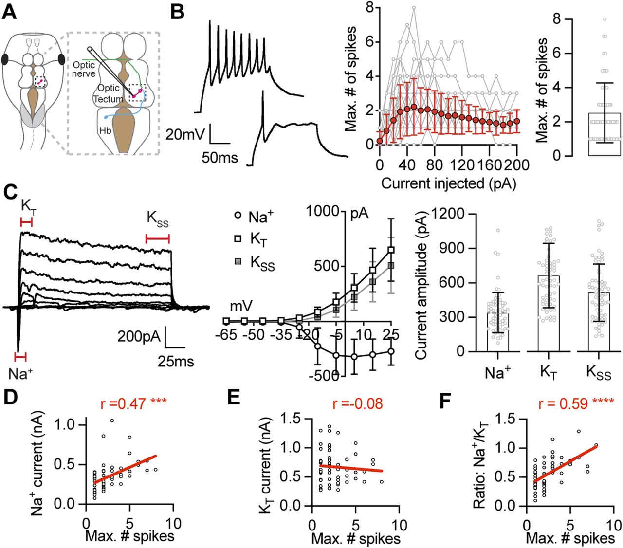 Figure 1. Intrinsic excitability of Xenopus tectal neurons is correlated with the amplitude of voltage-gated Na+ currents. (A) Diagram shows a Xenopus tadpole illustrating whole-cell recordings from a neuron of the optic tectum that receives innervation from visual and mechanosensory inputs. (B) Left: example current-clamp recordings showing the spiking response of two stage 49 tectal neurons held at −65 mV to a 50 pA current injection, illustrating the range of responses observed. Middle: plot shows the number of spikes elicited in response to 0–200 pA current injections for all cells analyzed (grey), and the average response (red, mean ± SD). Right: maximum number of spikes (median = 2 spikes, IQR 1–3 spikes, n = 61 cells). (C) Left: example voltage-clamp recording from a tectal neuron held at −65 mV in response to a series of depolarizing steps (−65 to +25 mV). Recording is leak subtracted to show only active currents. Middle: I–V plot shows average current amplitude for the Na+, the transient K+ (KT) and the steady state K+ currents (KSS). Right: peak current amplitudes (Na+: 341.4 ± 176.1 pA; KT: 666.9 ± 281.0 pA; KSS: 517.1 ± 251.2 pA; n = 61 cells). (D, E, F) Plots show Pearson correlations between intrinsic excitability (max. number of spikes) and (D) the amplitude of the Na+ current, (E) the transient K+ current, and (F) the ratio of the Na+ current to transient K+ current. r values are Pearson correlation coefficients (***P = 0.0002; ****P < 0.0001). The complete Pearson correlations matrix showing the relationships between all biophysical properties measured is presented in Fig S1. |