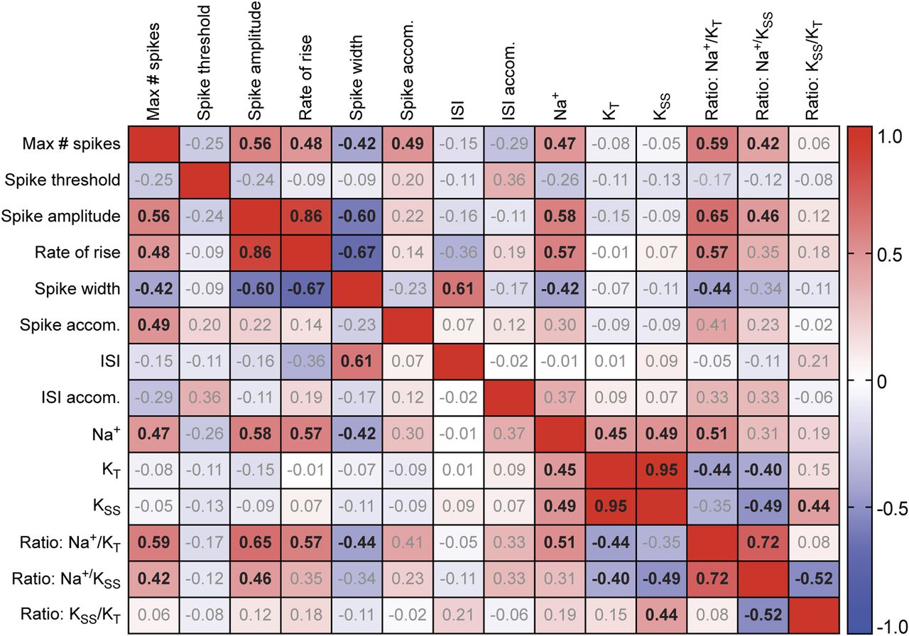 Figure S1. Relationship between biophysical properties of Xenopus tectal neurons at developmental stage 49. Pearson correlation matrix showing the relationship between cell properties for 61 stage 49 tectal neurons. Properties analyzed included neuronal intrinsic excitability (Max # spikes), characteristics of the first spike (spike threshold, spike amplitude, the rate of rise [20–80%], and spike width at 50%), and peak amplitudes for the voltage-gated fast Na+ current (Na+), transient potassium current (KT), and steady state potassium current (KSS). For 40 cells, we measured spike accommodation (Spike accom. = amplitude spike 1/amplitude spike 2), interspike interval (interstimulus intervals [ISI] = time peak of spike 1 − time peak of spike 2). For 22 cells, we measured interspike interval accommodation (ISI accom. = ISI spike 2–3/ISI spike 1–2). Values are Pearson correlation values (r). Bolded values indicate significant Pearson correlations (Bonferroni-corrected P-value < 0.05). |