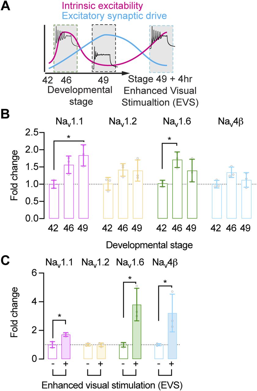 Developing neurons adapt their intrinsic excitability to maintain stable output despite changing synaptic input. The mechanisms behind this process remain unclear. In this study, we examined Xenopus optic tectal neurons and found that the expressions of Nav1.1 and Nav1.6 voltage-gated Na+ channels are regulated during changes in intrinsic excitability, both during development and becsuse of changes in visual experience. Using whole-cell electrophysiology, we demonstrate the existence of distinct, fast, persistent, and resurgent Na+ currents in the tectum, and show that these Na+ currents are co-regulated with changes in Nav channel expression. Using antisense RNA to suppress the expression of specific Nav subunits, we found that up-regulation of Nav1.6 expression, but not Nav1.1, was necessary for experience-dependent increases in Na+ currents and intrinsic excitability. Furthermore, this regulation was also necessary for normal development of sensory guided behaviors. These data suggest that the regulation of Na+ currents through the modulation of Nav1.6 expression, and to a lesser extent Nav1.1, plays a crucial role in controlling the intrinsic excitability of tectal neurons and guiding normal development of the tectal circuitry.