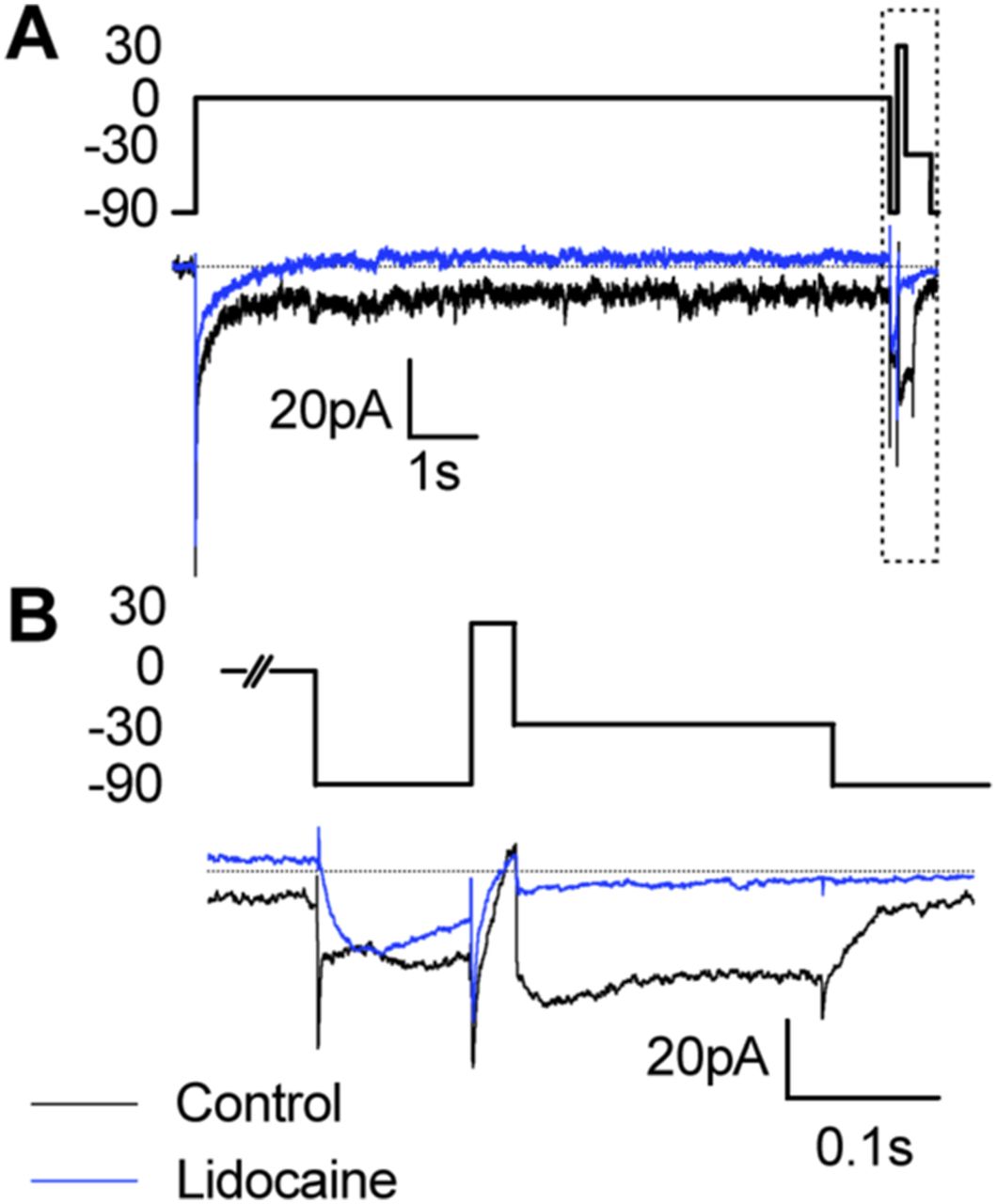 Figure S5. Effect of lidocaine on Na+ currents in tectal neurons. (A) Example voltage-clamp recordings showing the effect of 1 µM lidocaine on the Na+ currents after a 10 s depolarization step to 0 mV, which allows for lidocaine block of open Na+ channels. Recordings were made with a Tris-based internal saline in stage 49 control tectal neurons (black) or tectal neurons exposed to lidocaine (blue). (B) Box indicates portion of each trace shown in (B). (B) Magnification of each trace illustrates how lidocaine affects the fast, persistent, and resurgent Na+ currents. Quantification is shown in Table S2. |